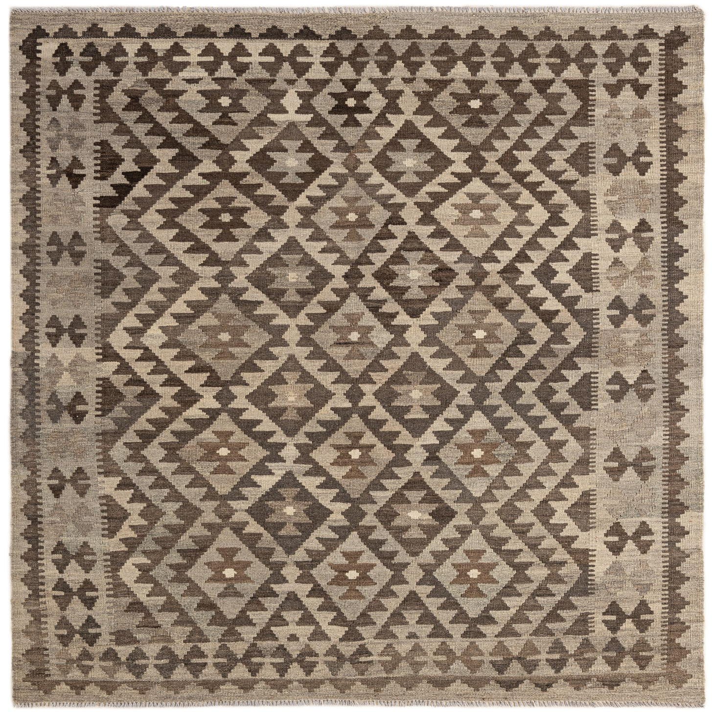 A 4x6 rectangular Kilim Maymana rug featuring a tribal geometric pattern in shades of gray and silver.