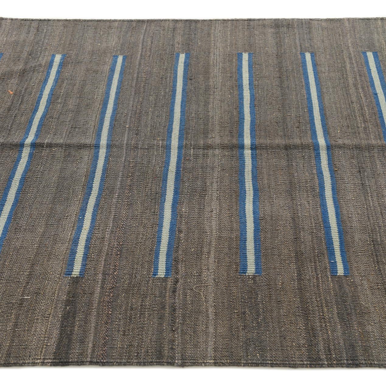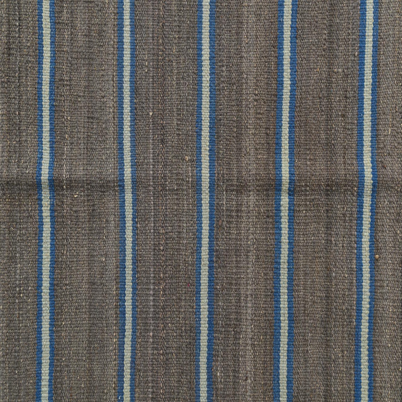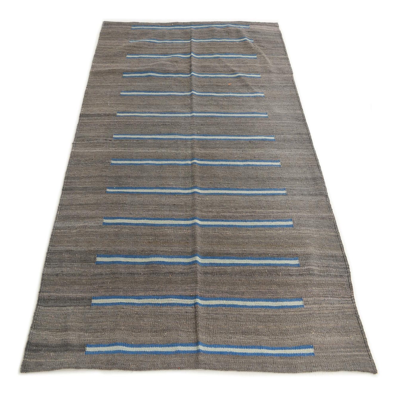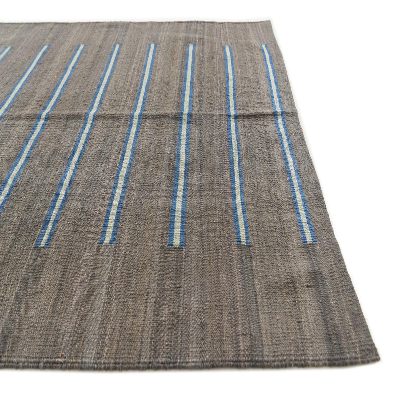 A 4x6 rectangular gray flatweave wool rug with horizontal blue and light blue stripes, ideal for a living room.
