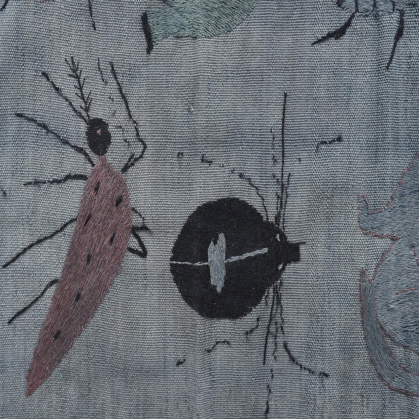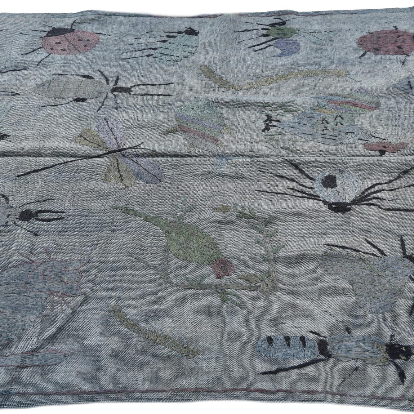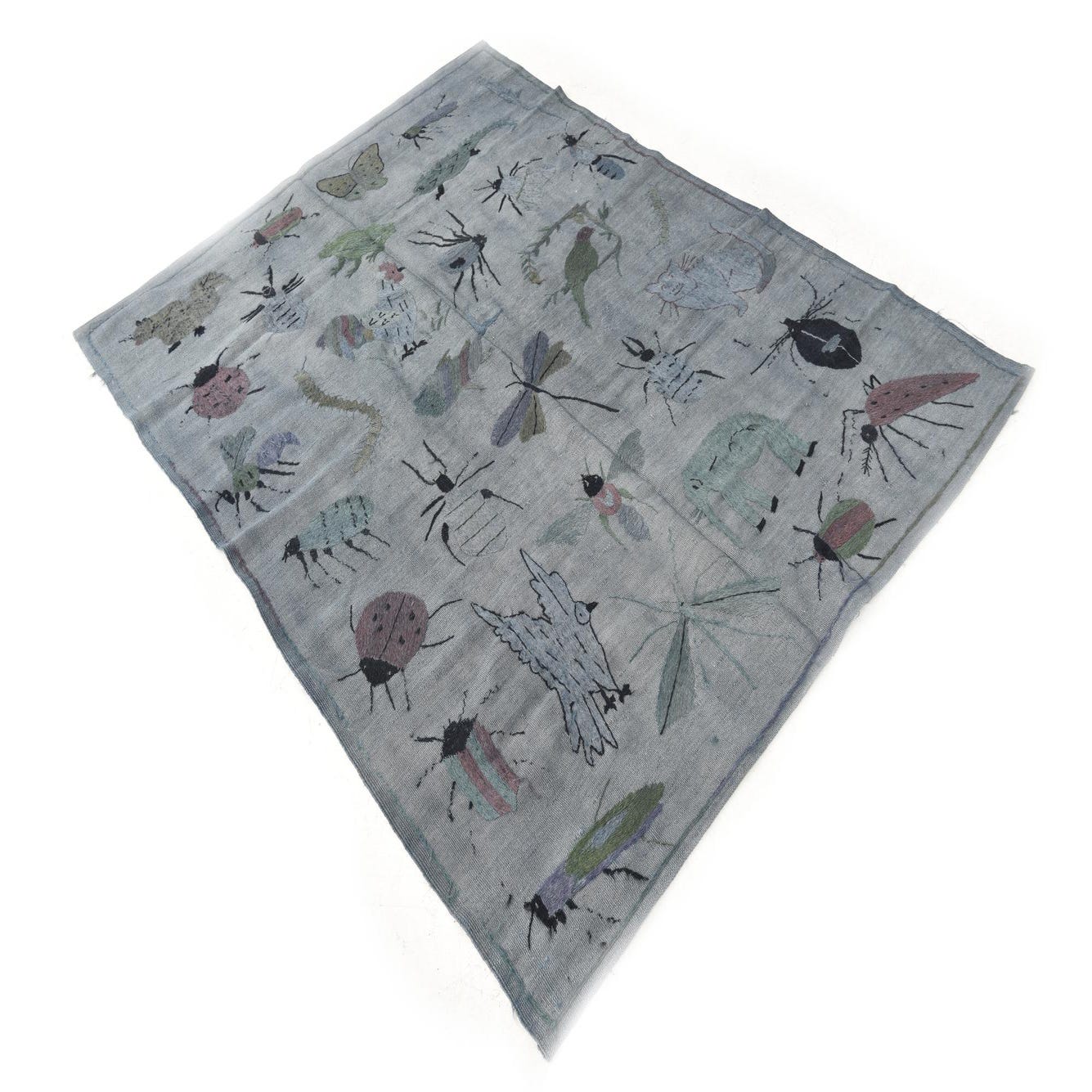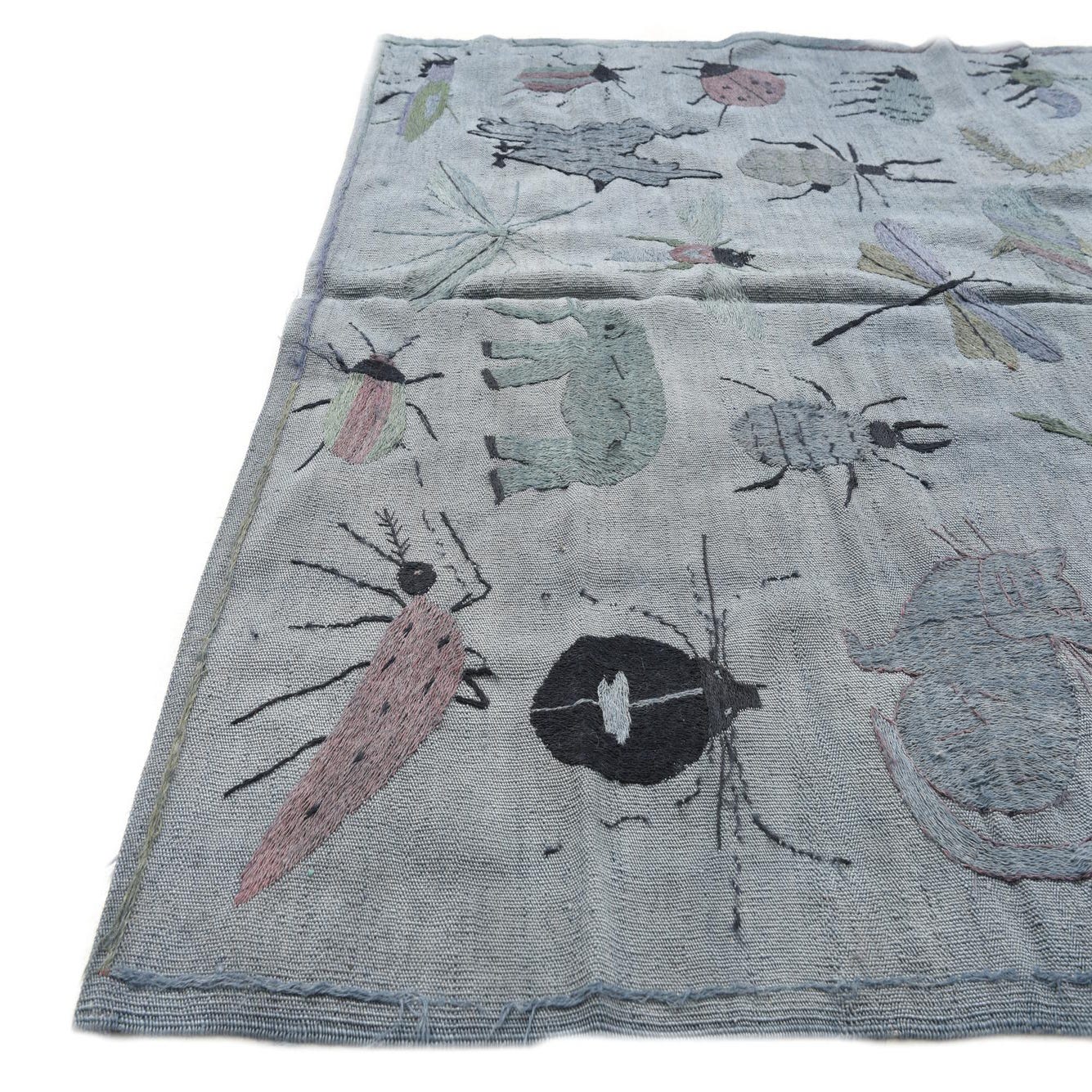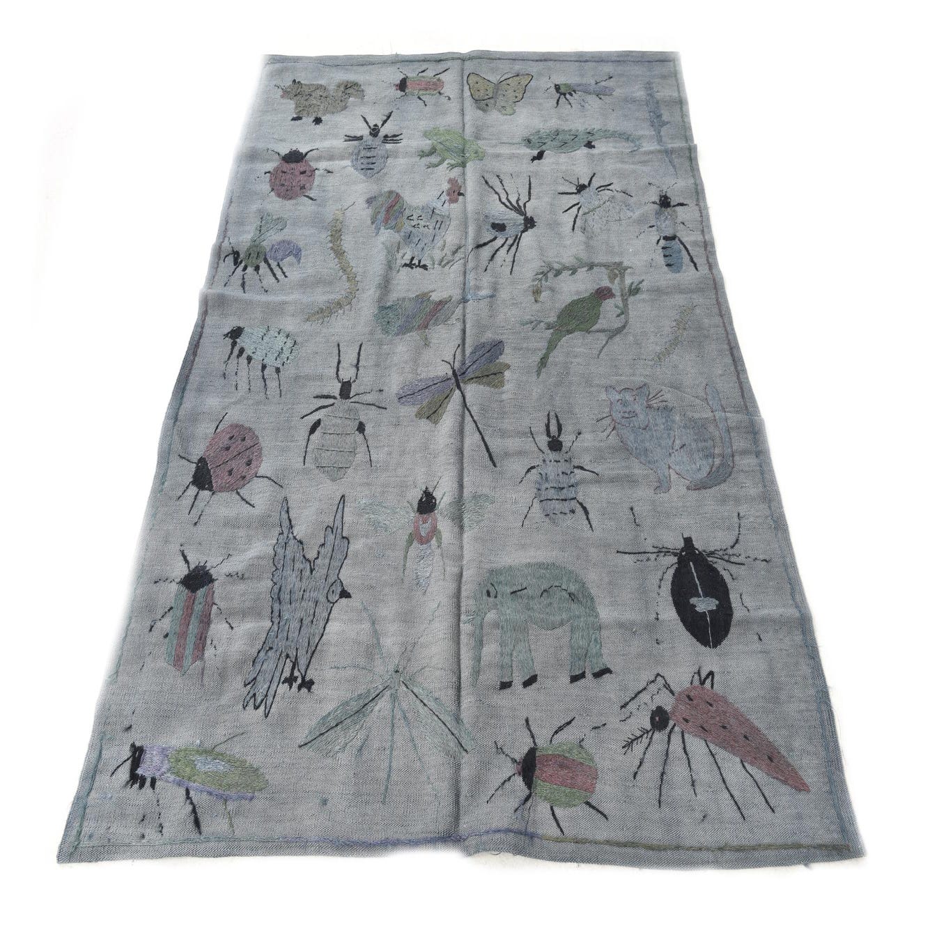 A 4x6 rectangular gray flatweave rug with a colorful, whimsical pattern of various insects and small animals.