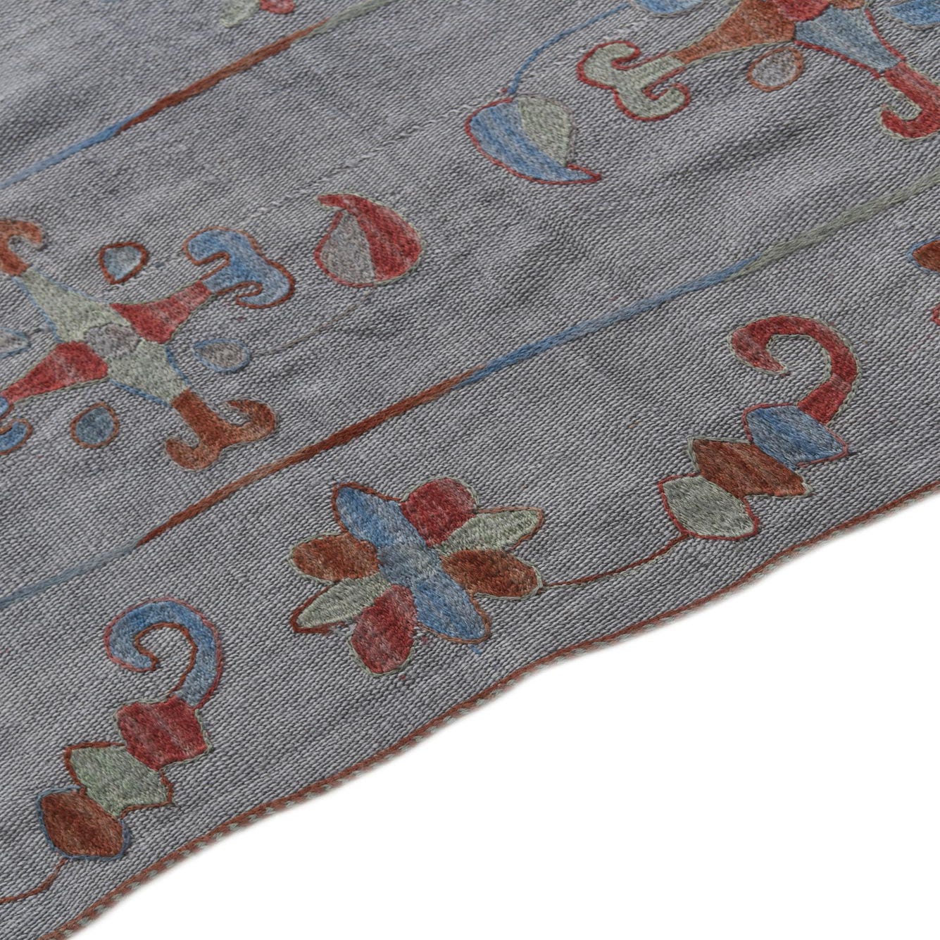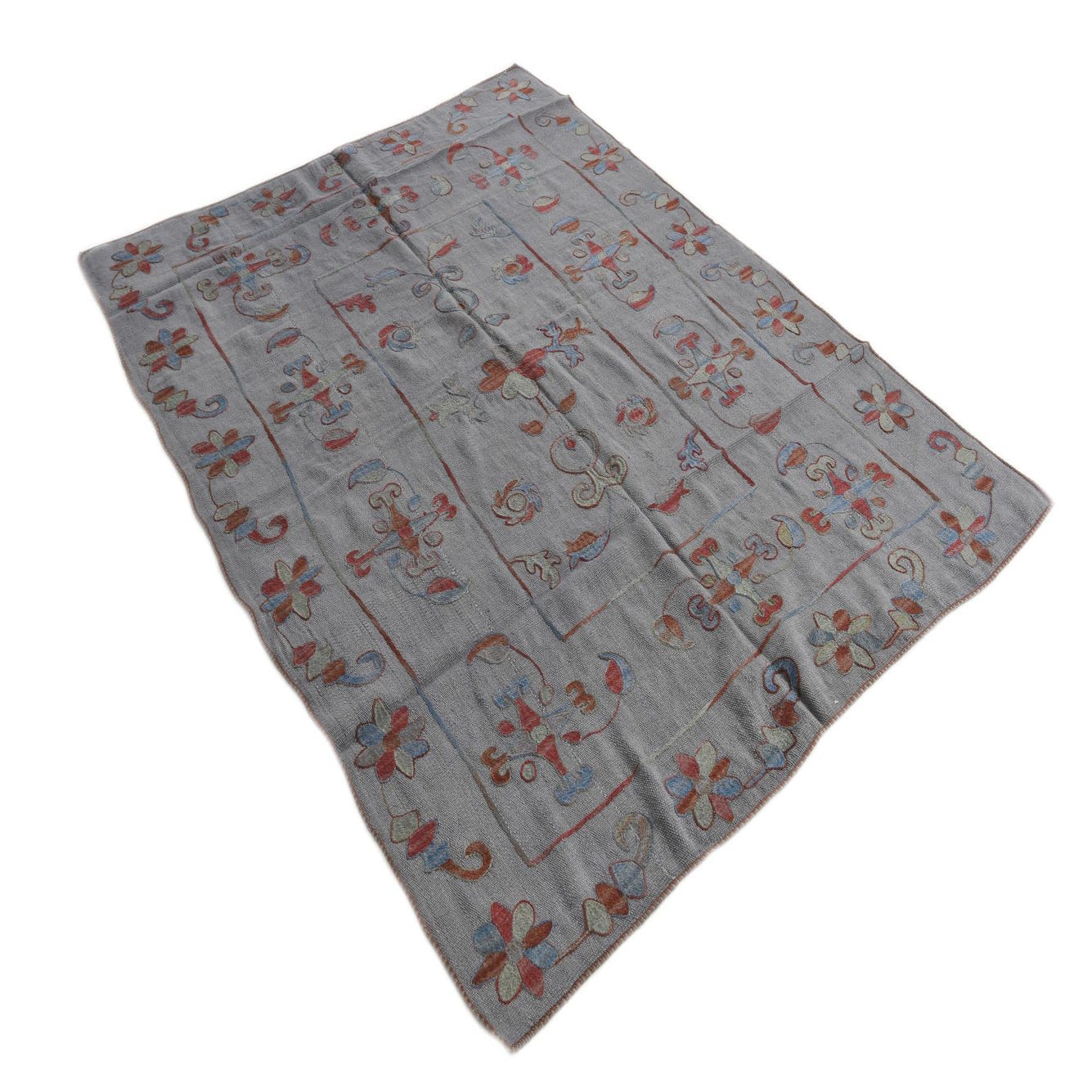 A 4x6 rectangular gray flatweave rug with a colorful tribal floral pattern in red, blue, and green hues.