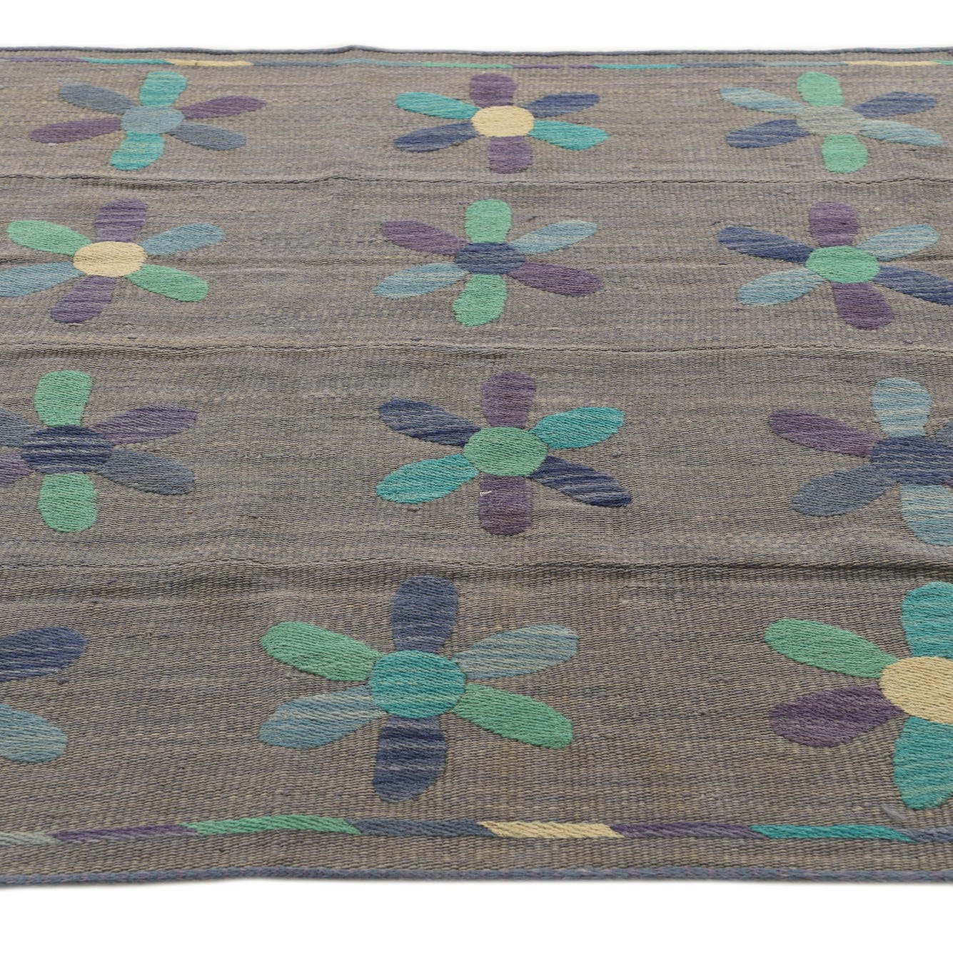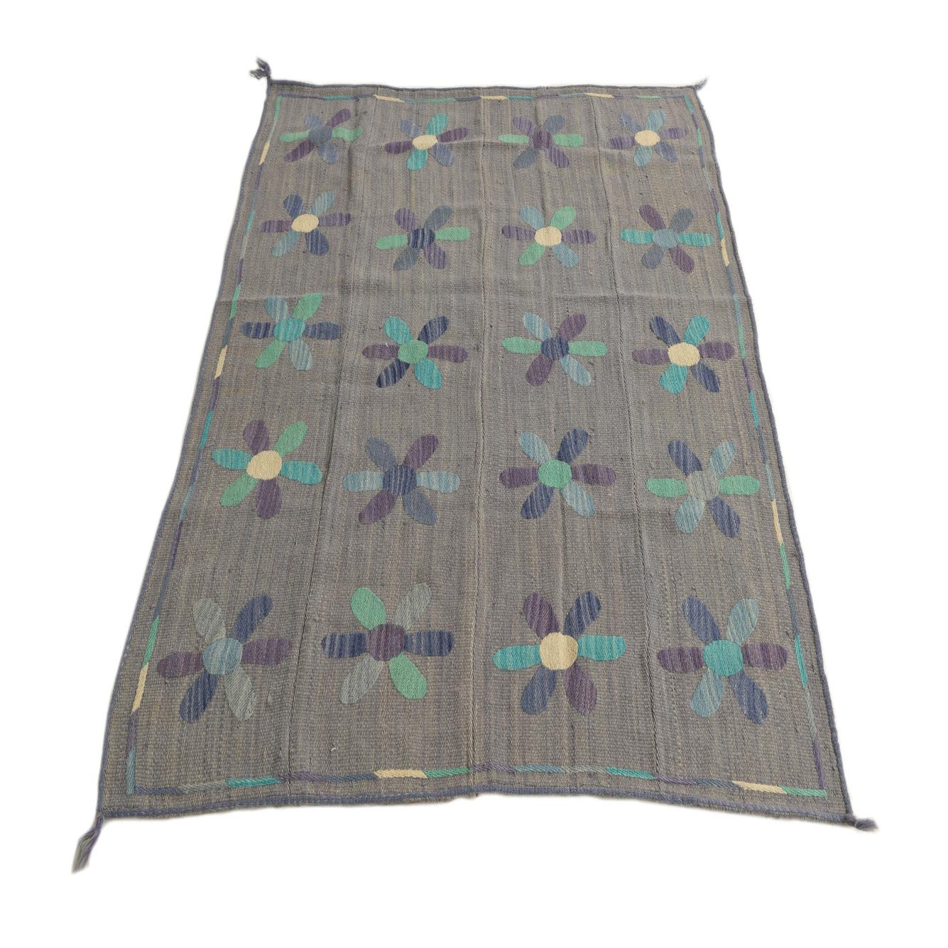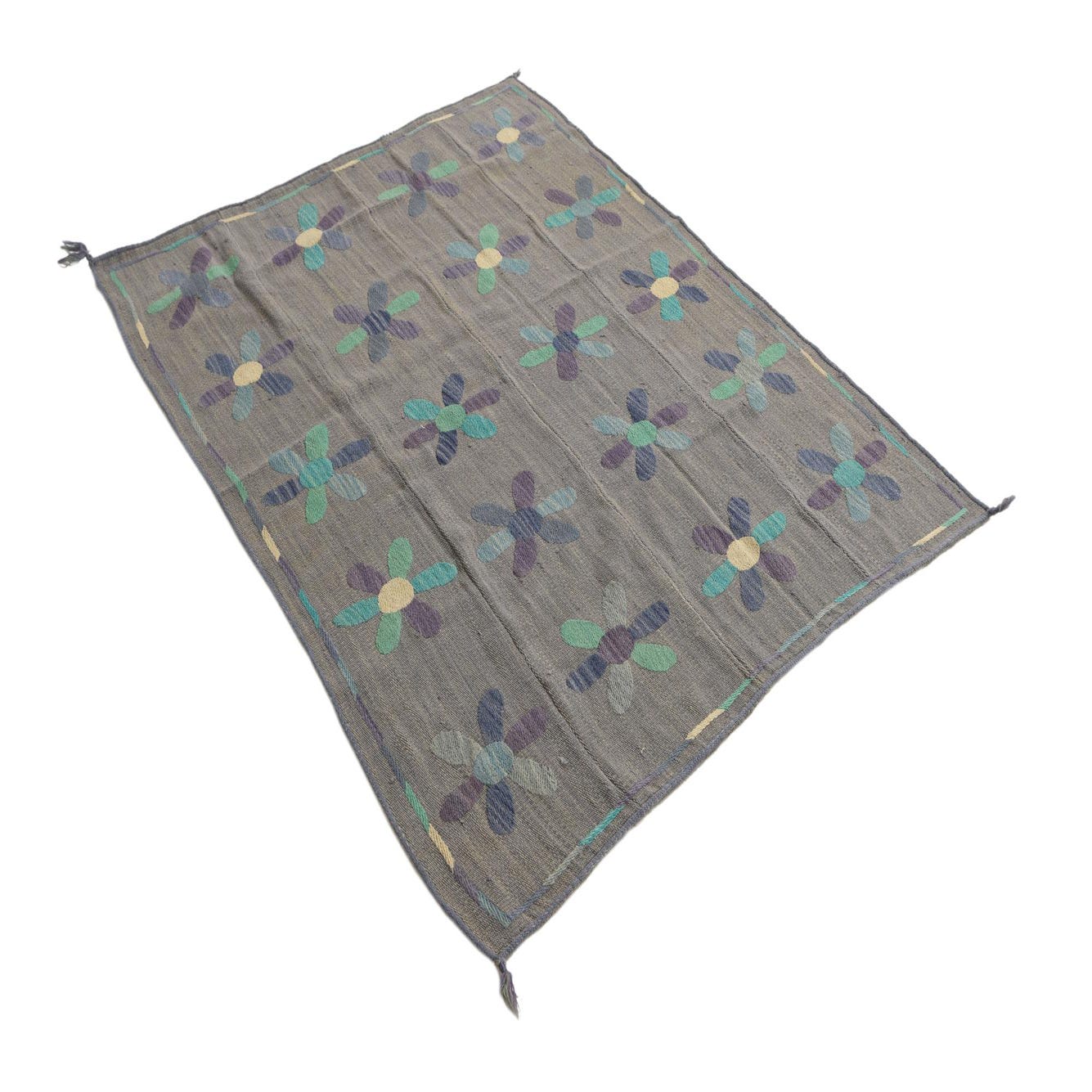 A 4x6 rectangular gray flatweave rug with a repeating pattern of colorful floral medallions in blue, purple, and teal.