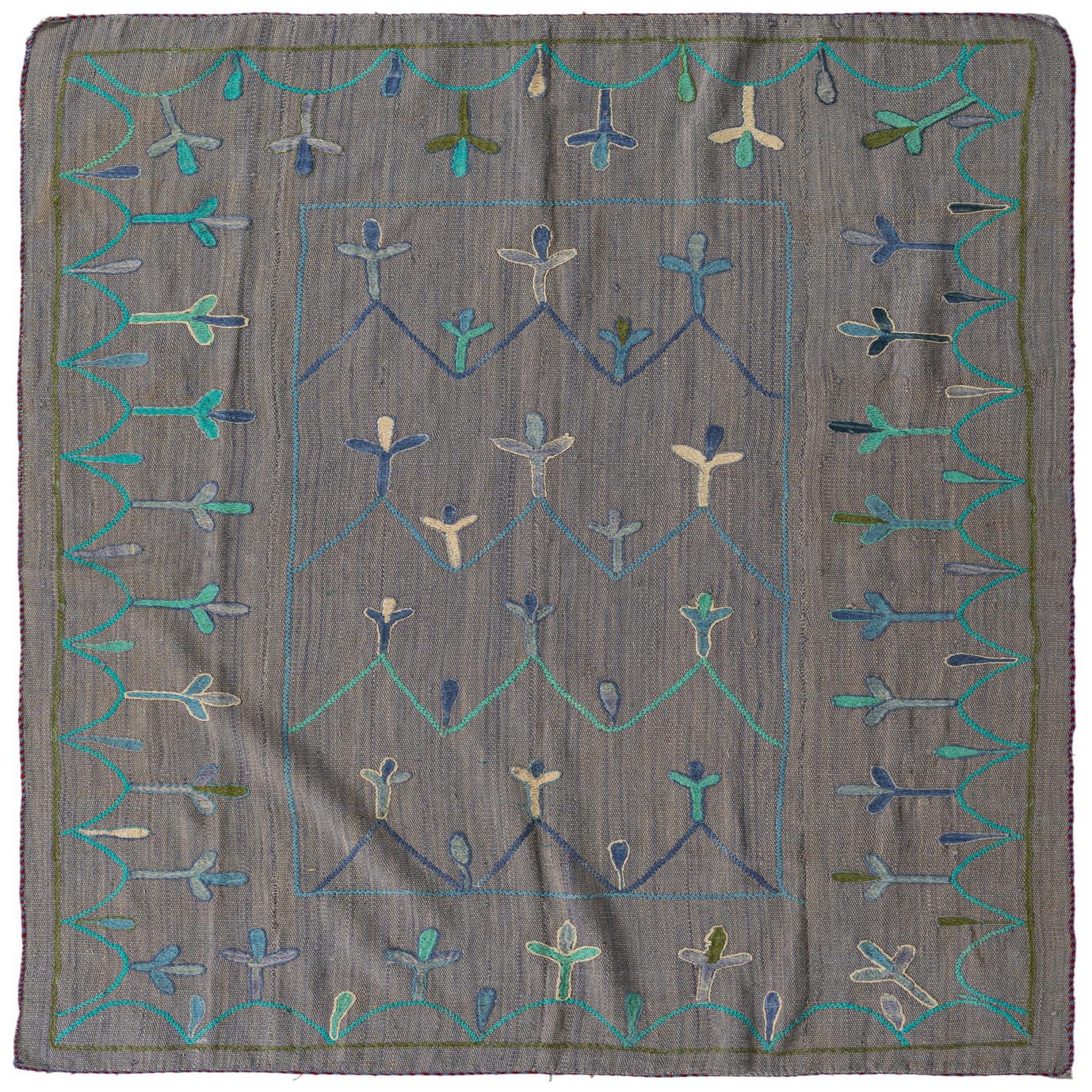A 4x6 rectangular gray flatweave rug with a tribal pattern of blue, teal, and cream leaf-like motifs.