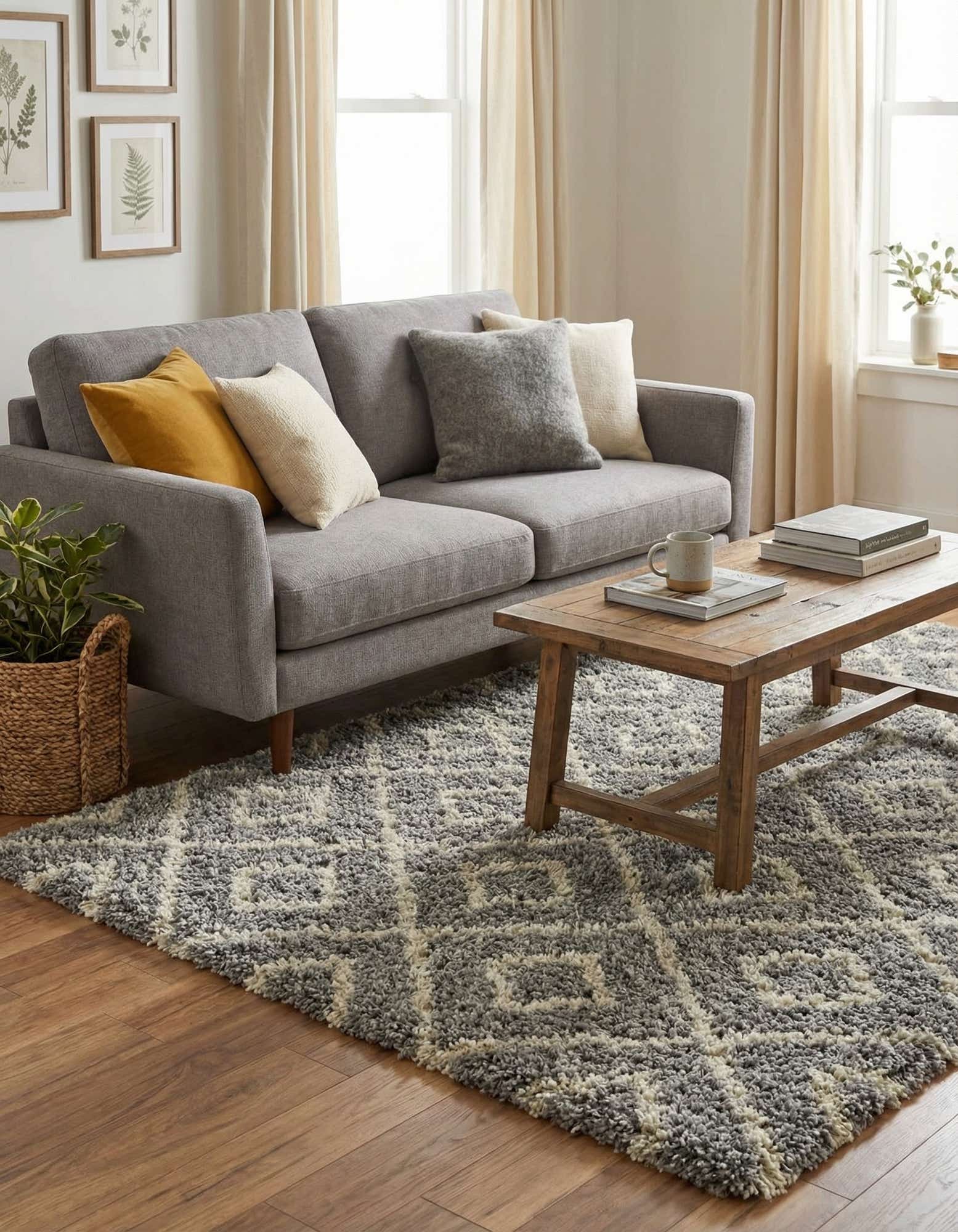 The clean geometric motif and muted gray-and-ivory palette suit contemporary, transitional, or Scandinavian interiors. Place it to anchor a small seating area, soften the space beside a bed, or add warmth to a reading nook or home office. It pairs nicely with cool-toned wood, white or gray upholstery, and metal accents for a calm, layered look.