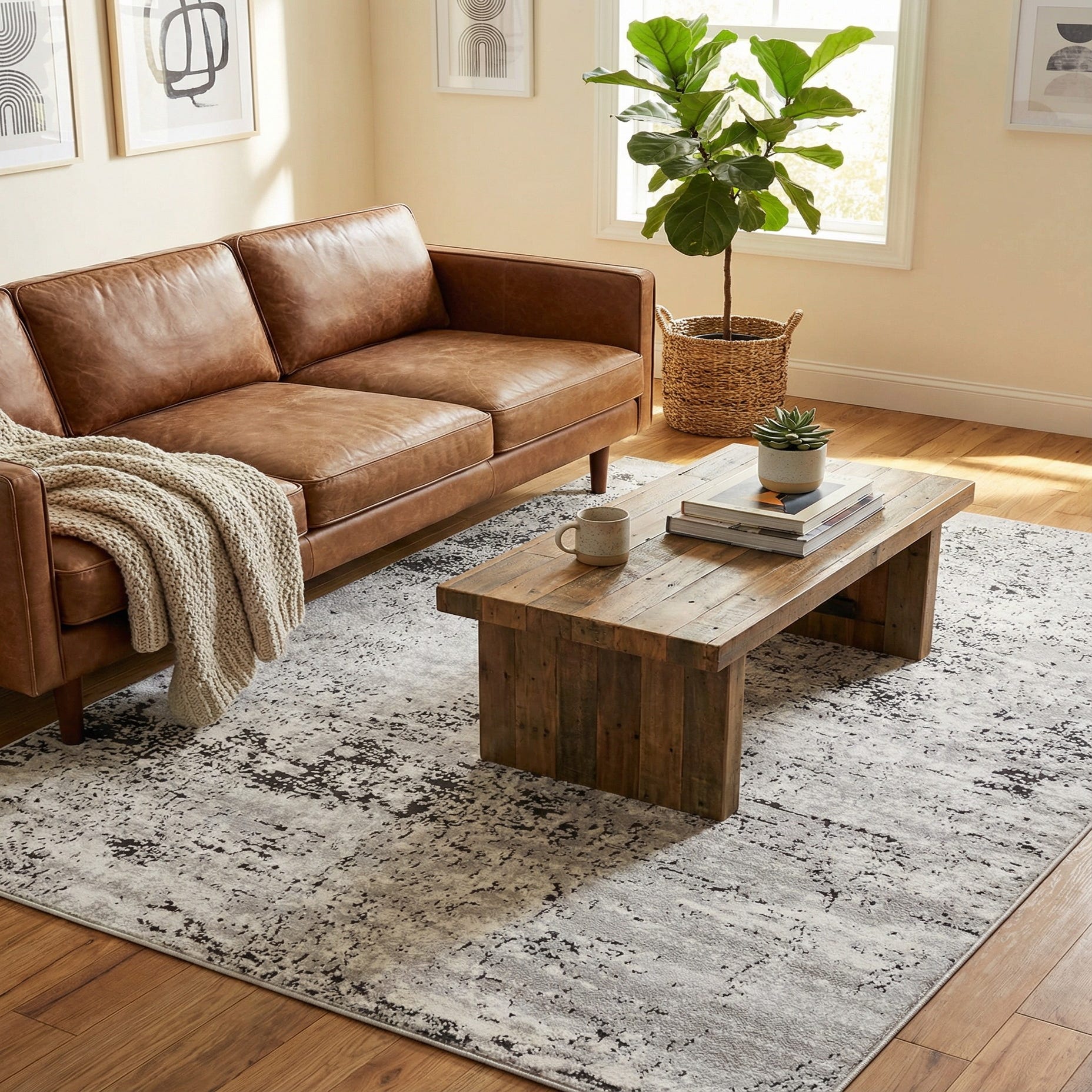 The neutral gray-and-ivory palette and modern distressed motif work well in a range of interiors. Use it to anchor a compact living room seating area or place it beneath a bed to introduce subtle texture without overpowering other elements. It also pairs nicely with minimalist furniture, natural wood tones, and metal accents in home offices or entryways, bringing a calm, updated look to transitional and contemporary spaces.