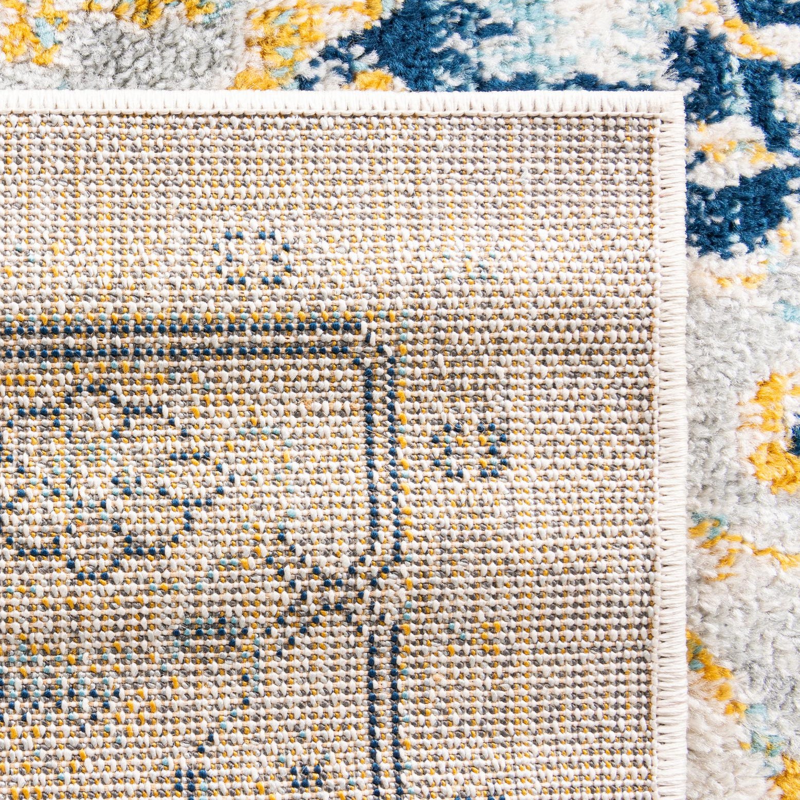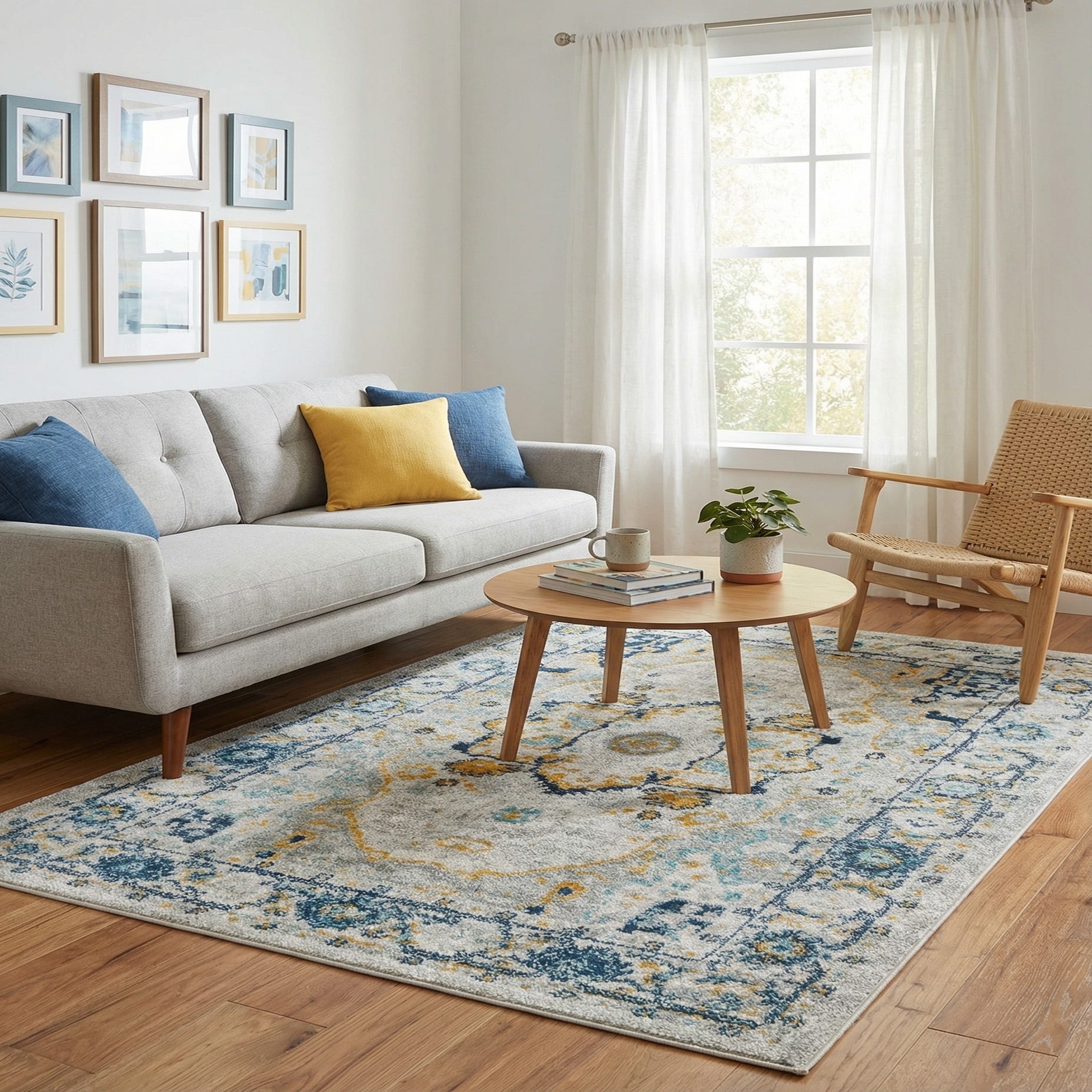 A vintage-inspired medallion pattern sits on a soft gray field, with an ivory-toned central motif framed by a worn navy blue border and scattered accents of yellow and light blue. The distressed detailing gives the design a gently aged look, while the color palette — gray background with navy, ivory, yellow and light blue highlights — provides balanced contrast without dominating a room. The surface has a low-to-medium pile with subtle textural variation, so it feels soft underfoot while showing the layered, time-worn character of the pattern.
