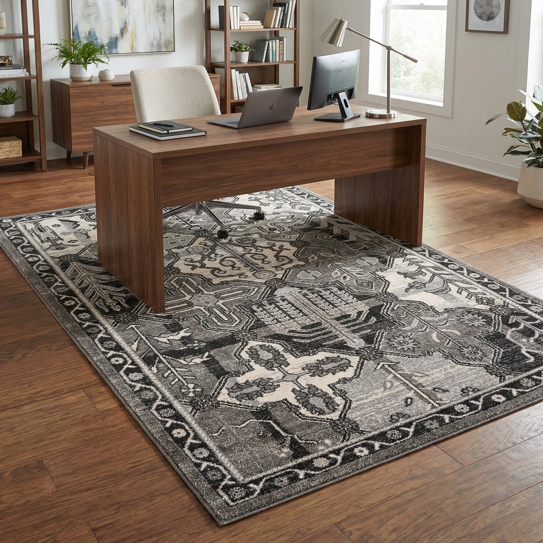 This rug works well as an anchor in a neutral living room or beneath a small dining table, and it pairs naturally with light wood floors, charcoal upholstery or matte-black metal accents. It also complements transitional and modern farmhouse schemes—layer it under a bench in an entryway or at the foot of a bed to add pattern without overwhelming the space. Soft textiles and warm metallic accessories bring out the ivory and silver tones for a cohesive, inviting setting.