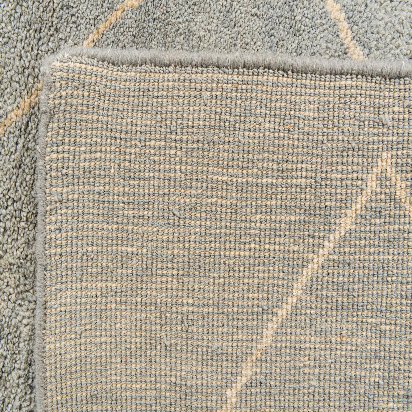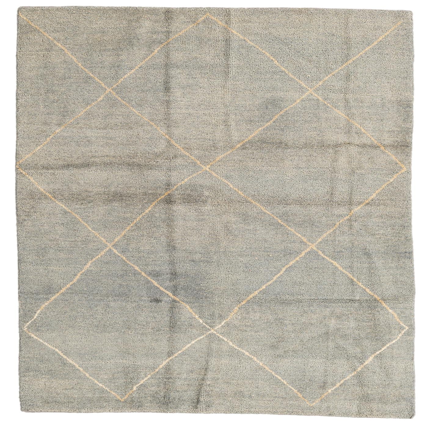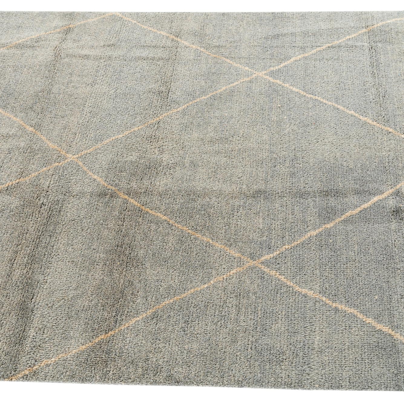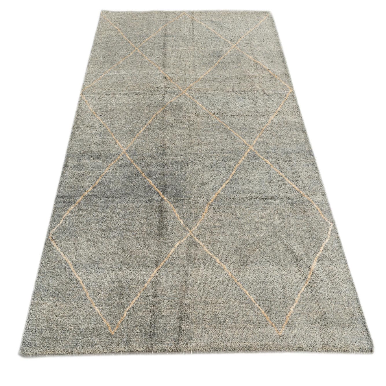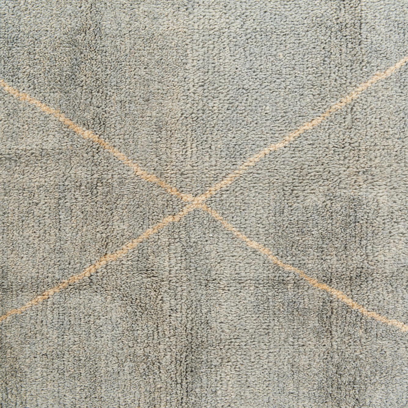 This hand-knotted Moroccan collection rug spans 4x6 feet and boasts a simplistic yet captivating pattern. The design features an understated gray background with a subdued cream motif that emulates the iconic geometric lines emblematic of traditional Moroccan craftsmanship. Constructed from 100% wool, the rug offers a soft texture and a resilient quality that promises durability.