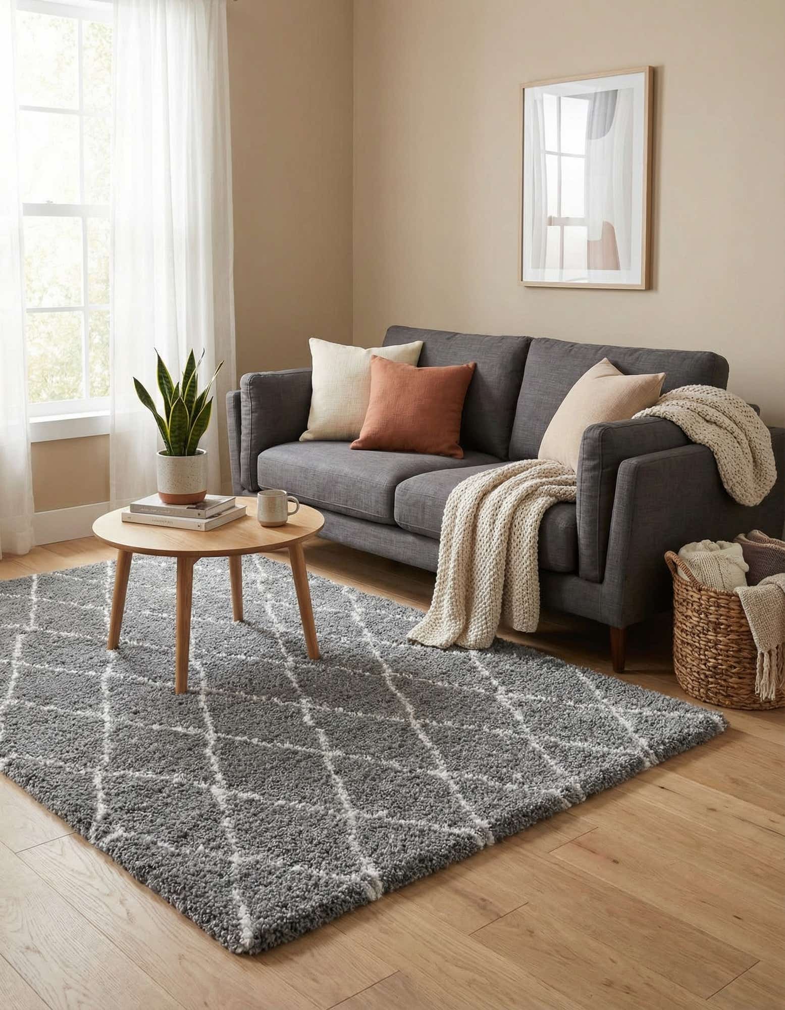 A 4x6 rectangular gray shag rug featuring a white diamond trellis pattern, perfect for a living room or bedroom.