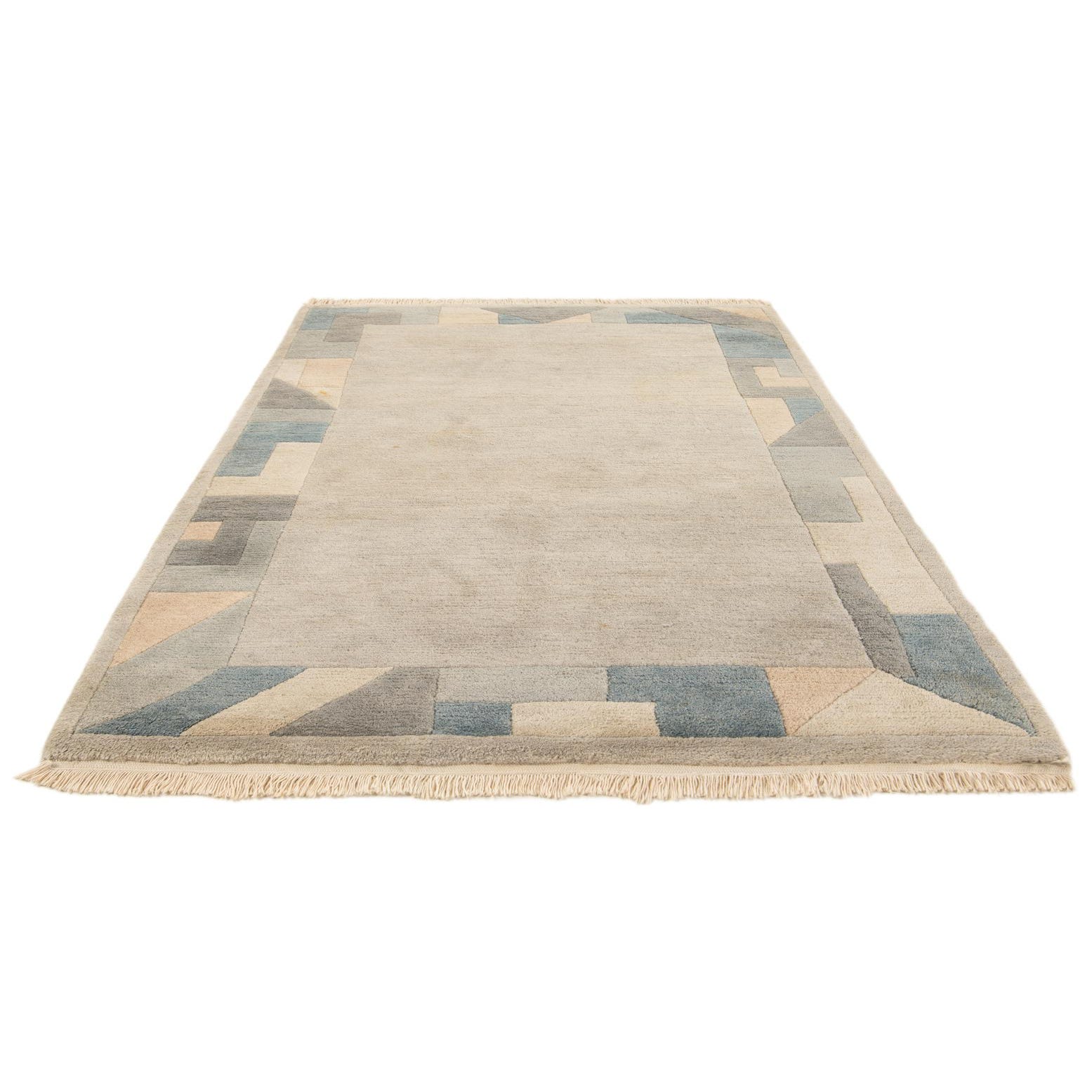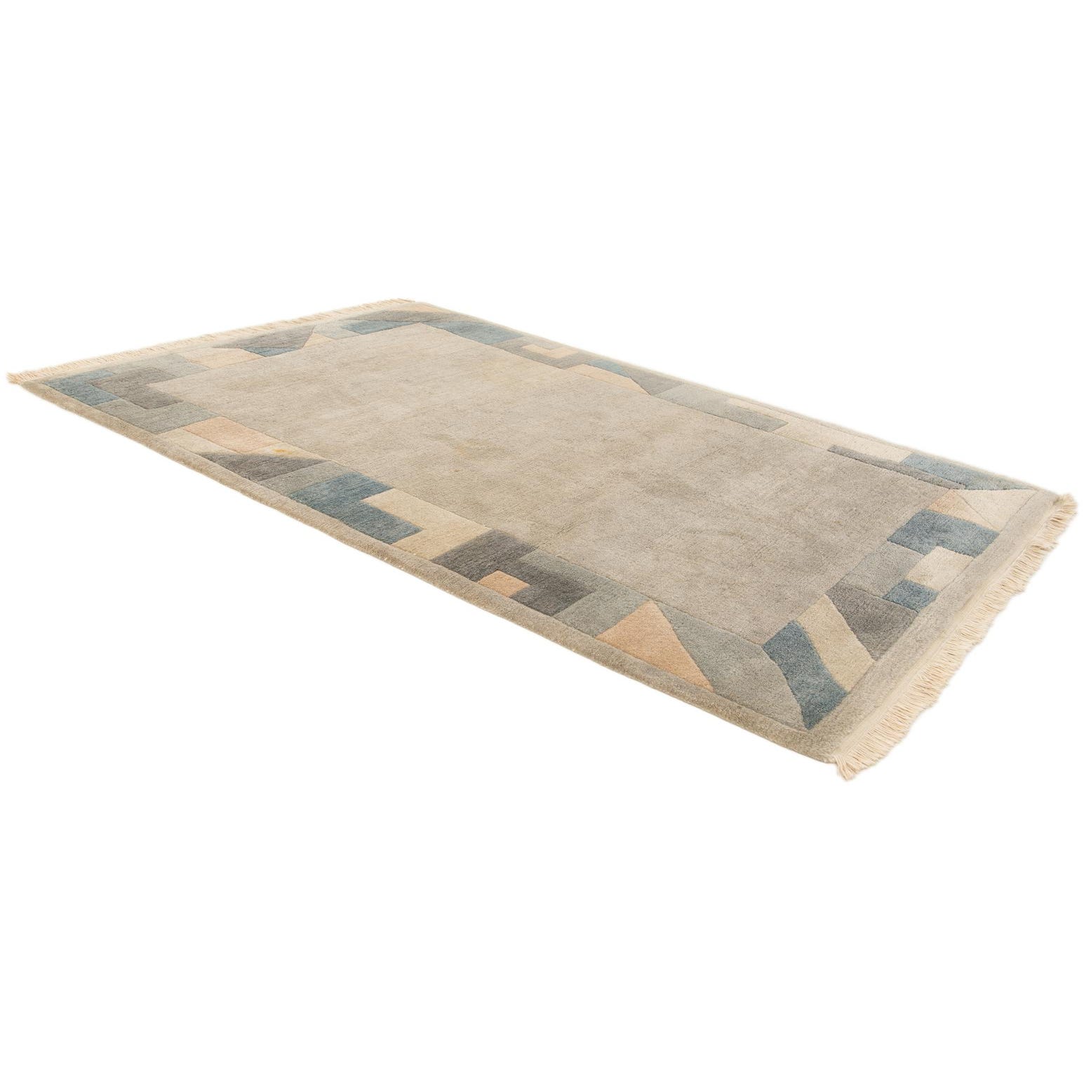 A 4x6 rectangular gray wool rug with a modern abstract border in shades of blue, gray, and peach, featuring geometric shapes and fringe.