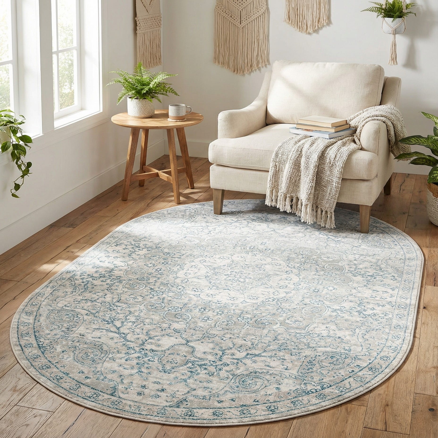 A subtle, vintage-inspired medallion and scrolling floral pattern rests on a cool gray ground, with pale blue accents and ivory highlights tracing the central motif and border. The oval shape softens angular furniture arrangements while the distressed detailing gives the design a lived-in, layered appearance. The low-pile surface has a smooth, even texture that lets the pattern hold definition without feeling bulky underfoot.