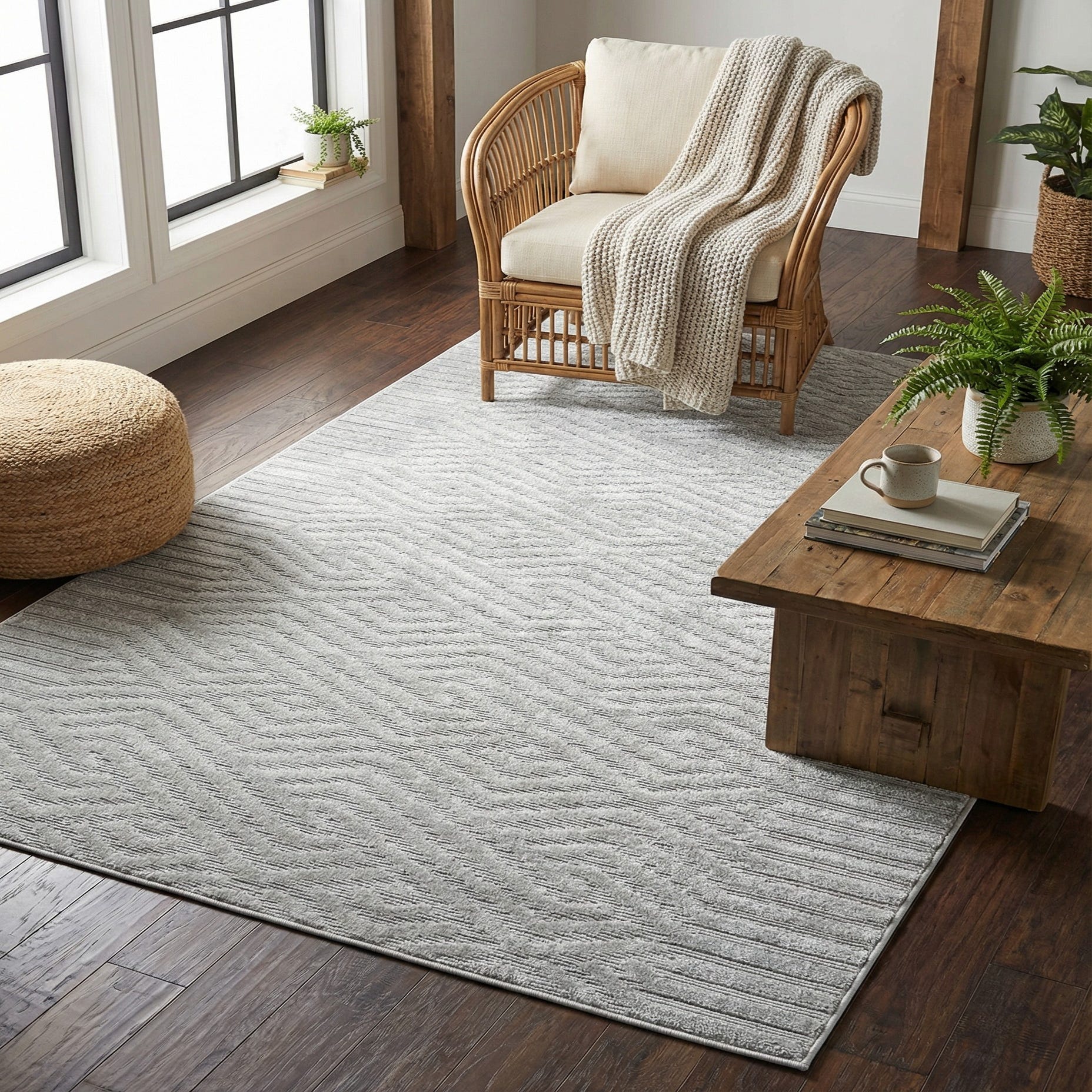 This understated, modern pattern pairs nicely with clean-lined furniture and natural materials — think a teak bistro set on a covered patio, a white wicker seating group on a screened porch, or a simple sofa and metal accent tables in a contemporary living room. Its low profile makes it a good anchor for small seating areas, entryways, or beneath a compact outdoor dining table, and the gray-and-ivory palette adapts easily to coastal, Scandinavian, and transitional schemes.
