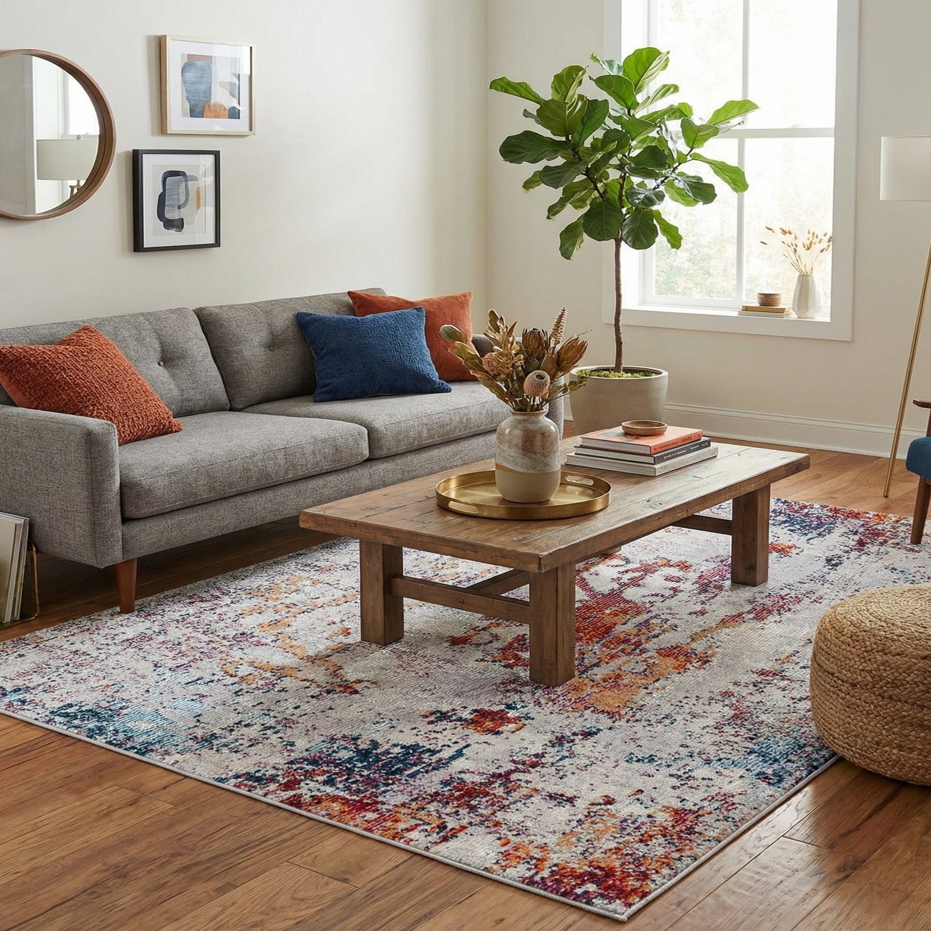Place this rug under a sofa and coffee table to anchor a modern living room, layer it in a neutral bedroom to introduce color, or add it to a home office for visual interest without overwhelming the space. It pairs well with mid-century wood pieces, clean-lined contemporary furniture, or eclectic textiles—use the blue and turquoise accents to complement cool palettes or the orange and red highlights to warm more muted schemes.
