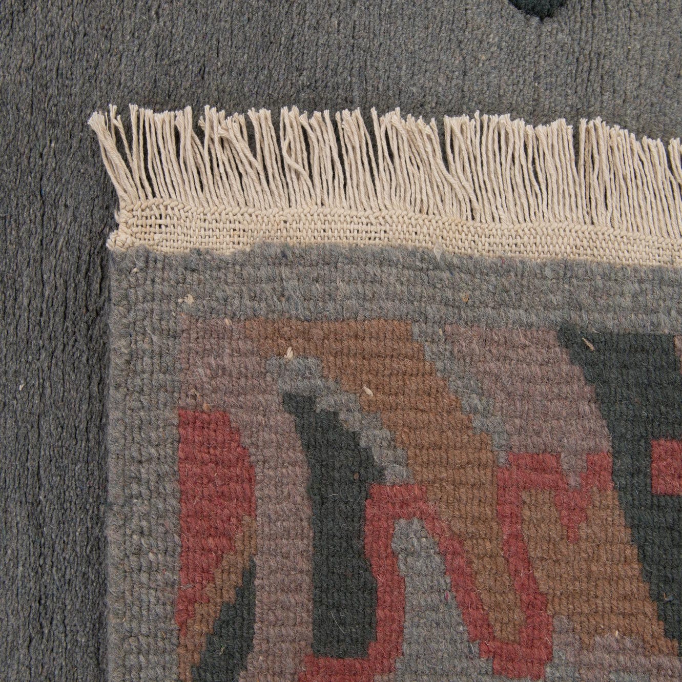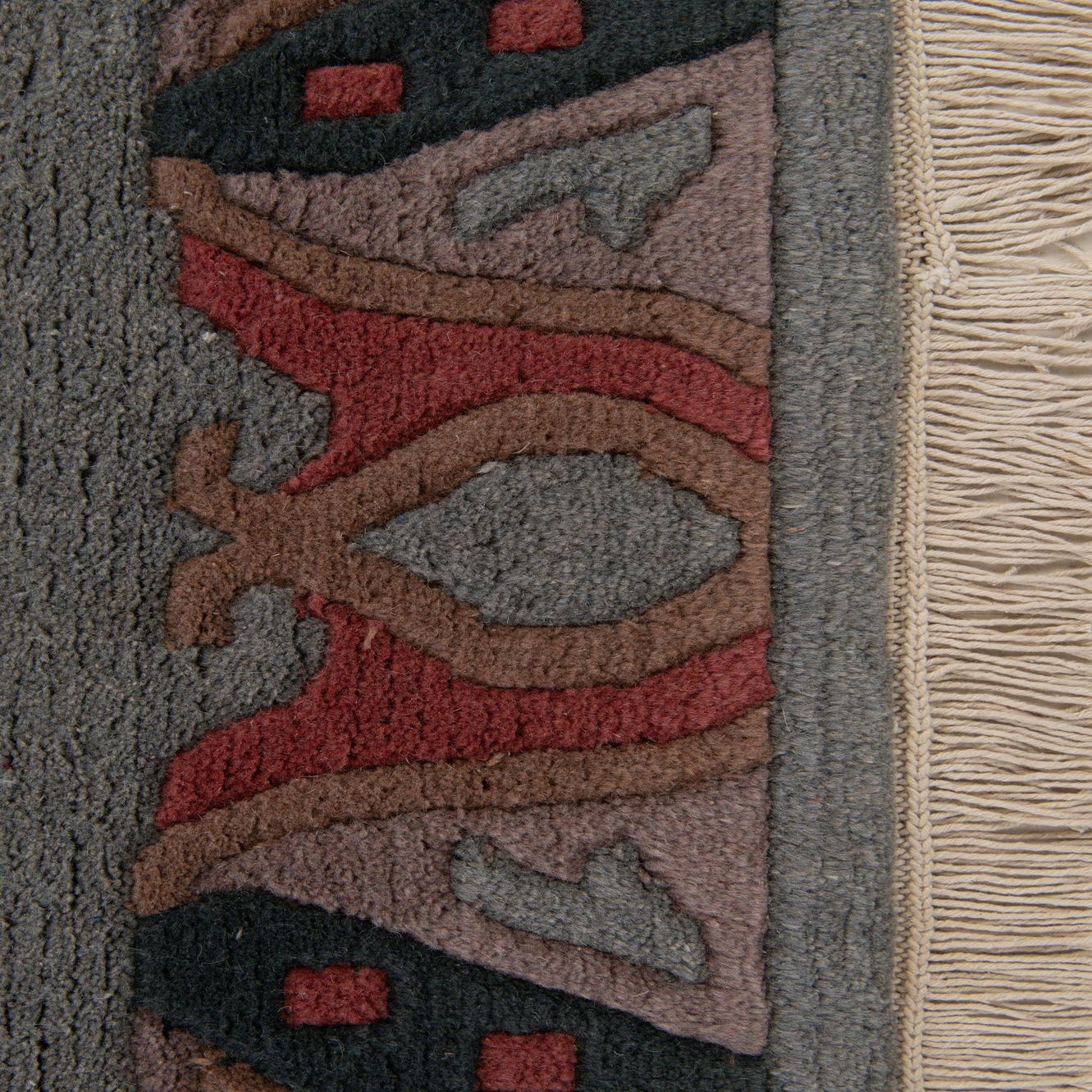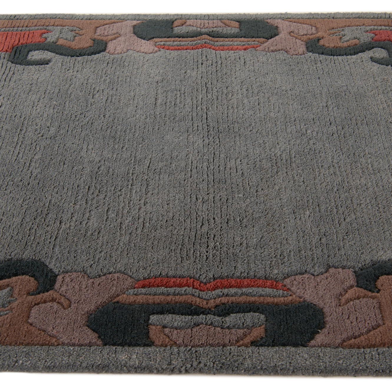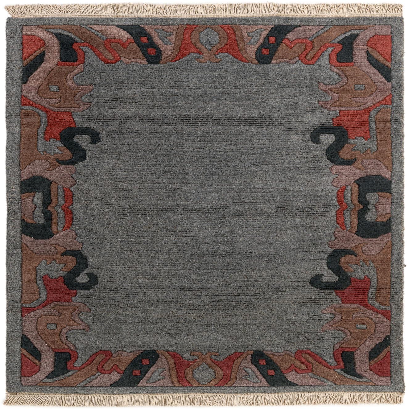 A 4x6 rectangular gray wool rug with a vibrant, abstract oriental border in red, black, brown, and pink tones, featuring fringe.