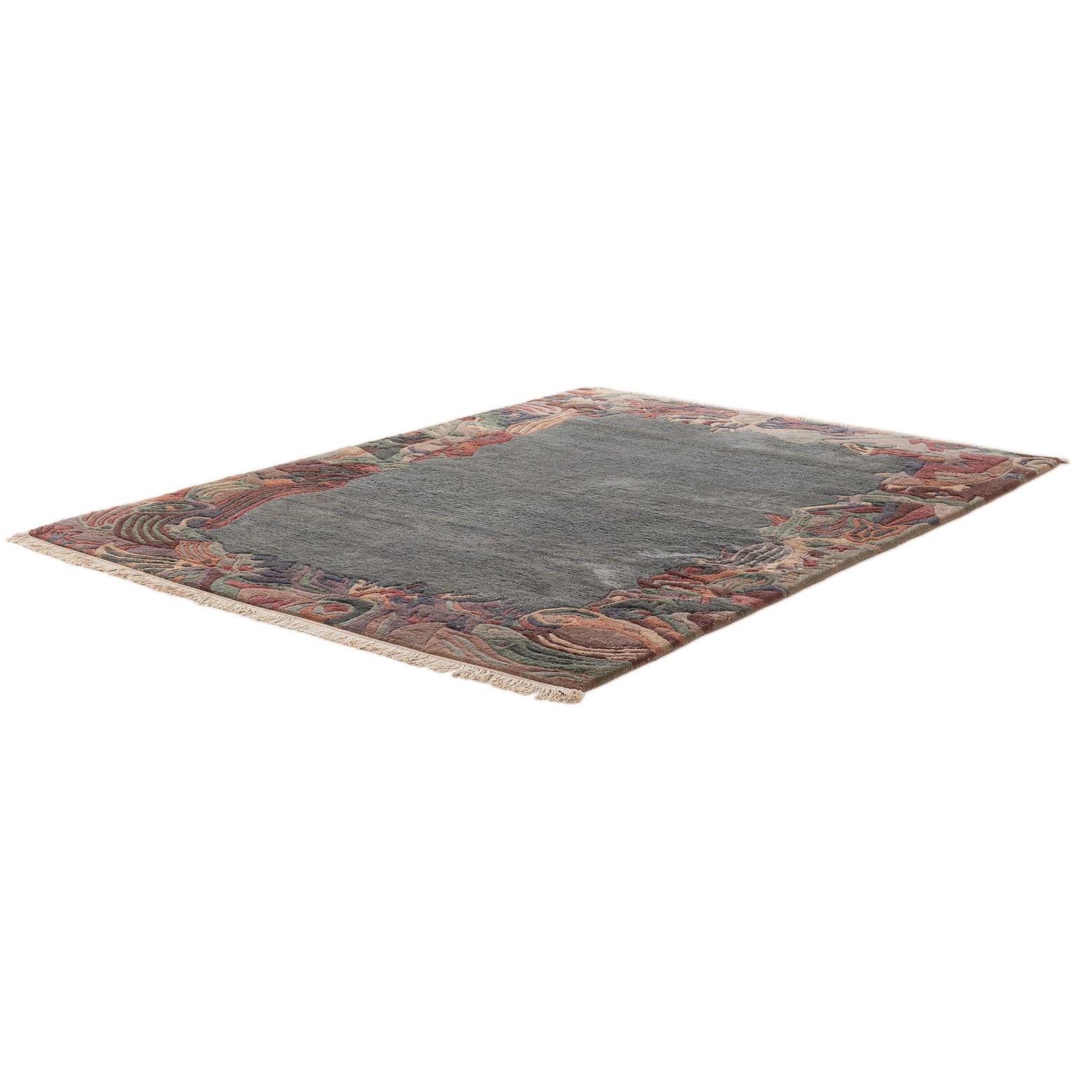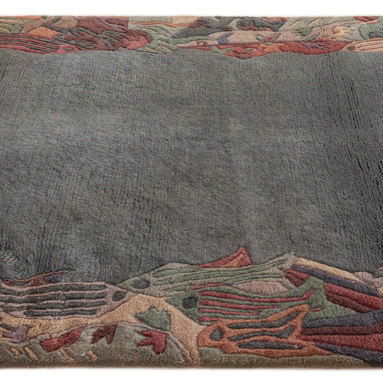 A 4x6 rectangular gray wool rug with a colorful, abstract modern-oriental border in various hues, featuring fringe.