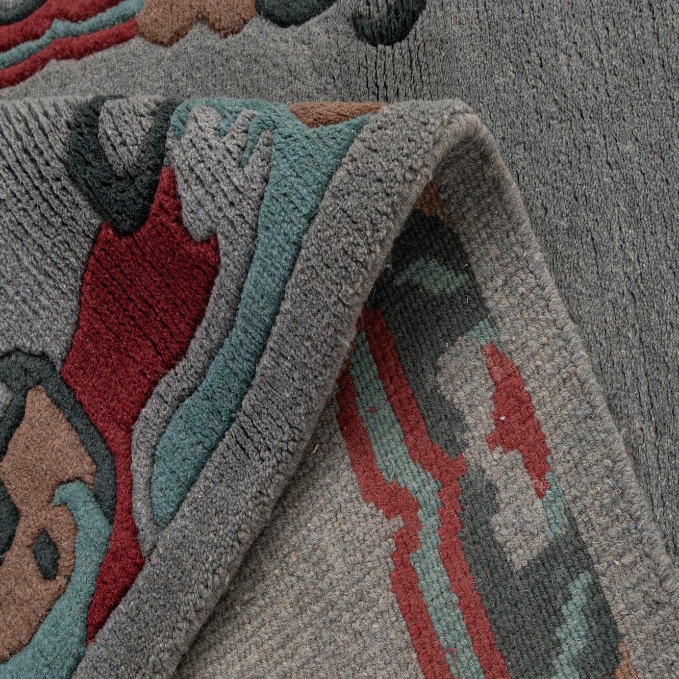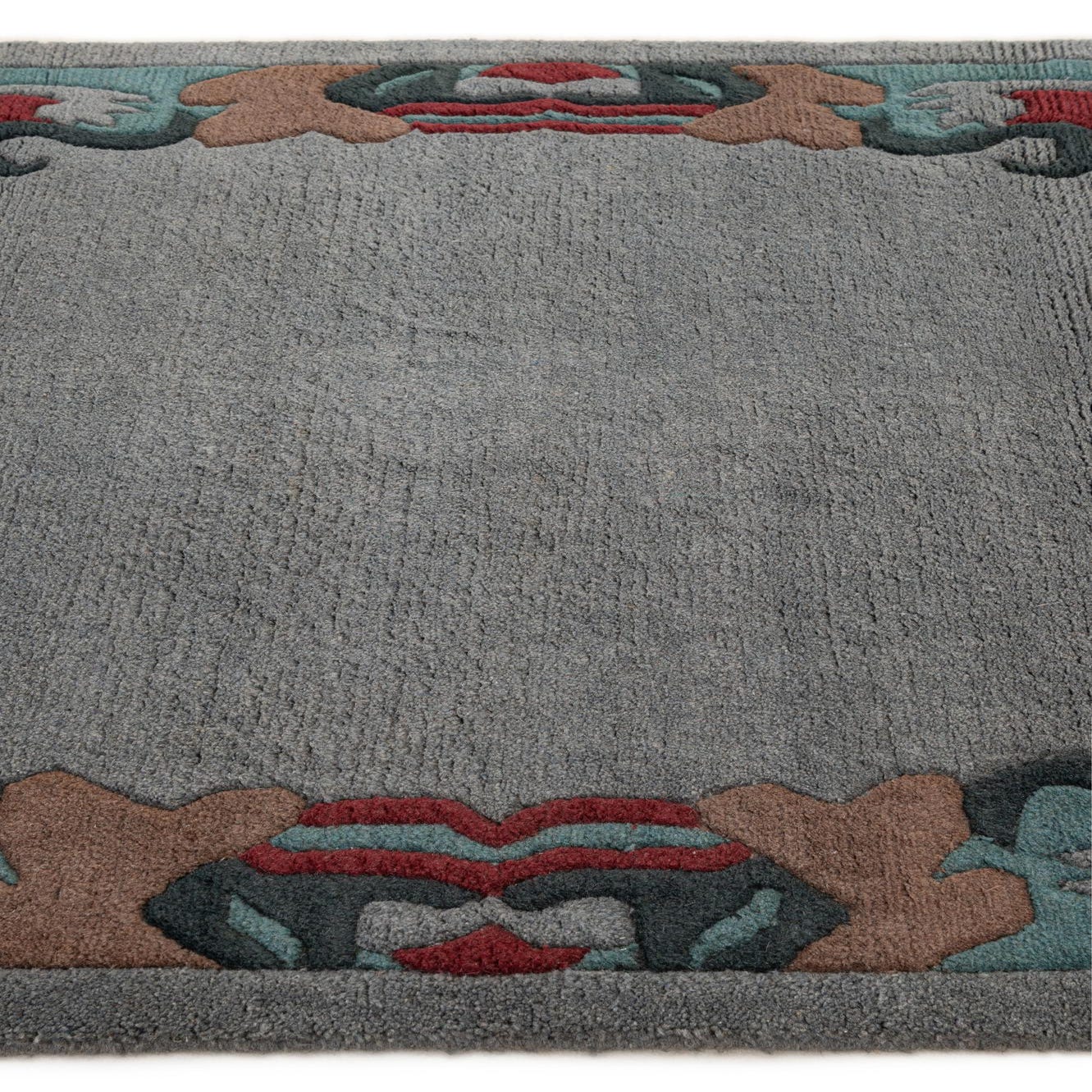 A 4x6 rectangular gray wool rug with a colorful modern oriental border in red, teal, and brown, suitable for a living room.