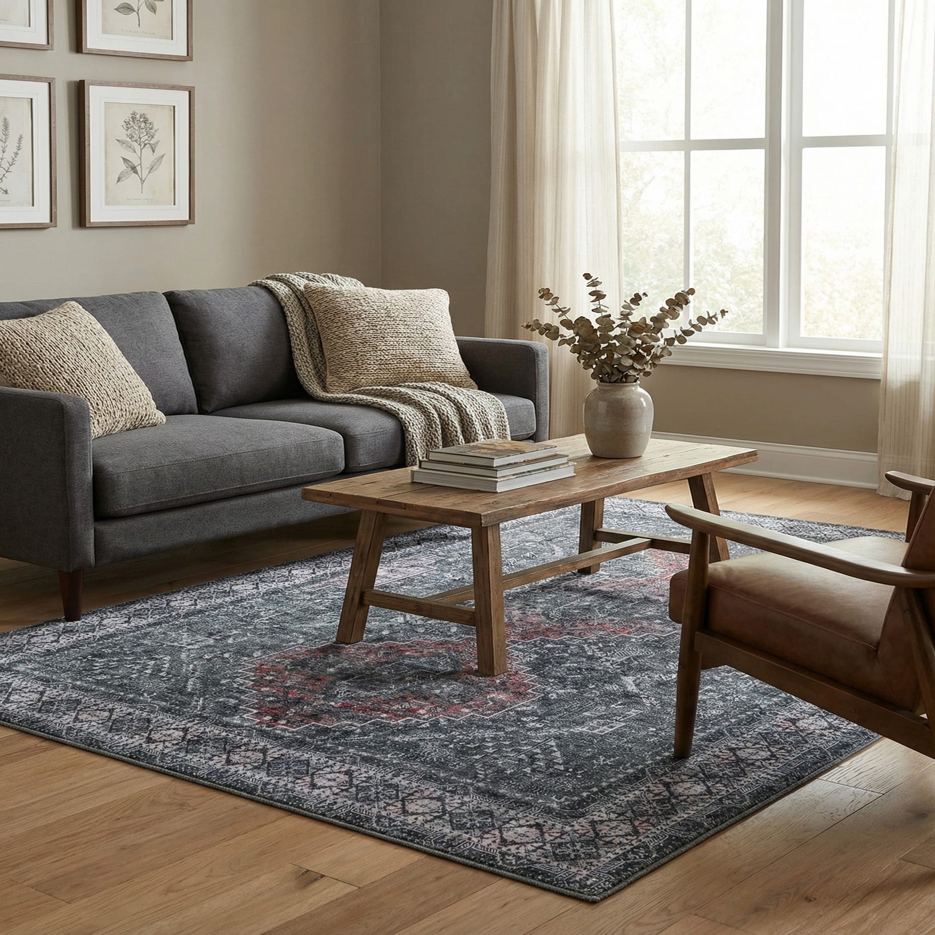 A 4x6 rectangular gray Oriental rug with a faded red medallion pattern and intricate border, suitable for a living room.