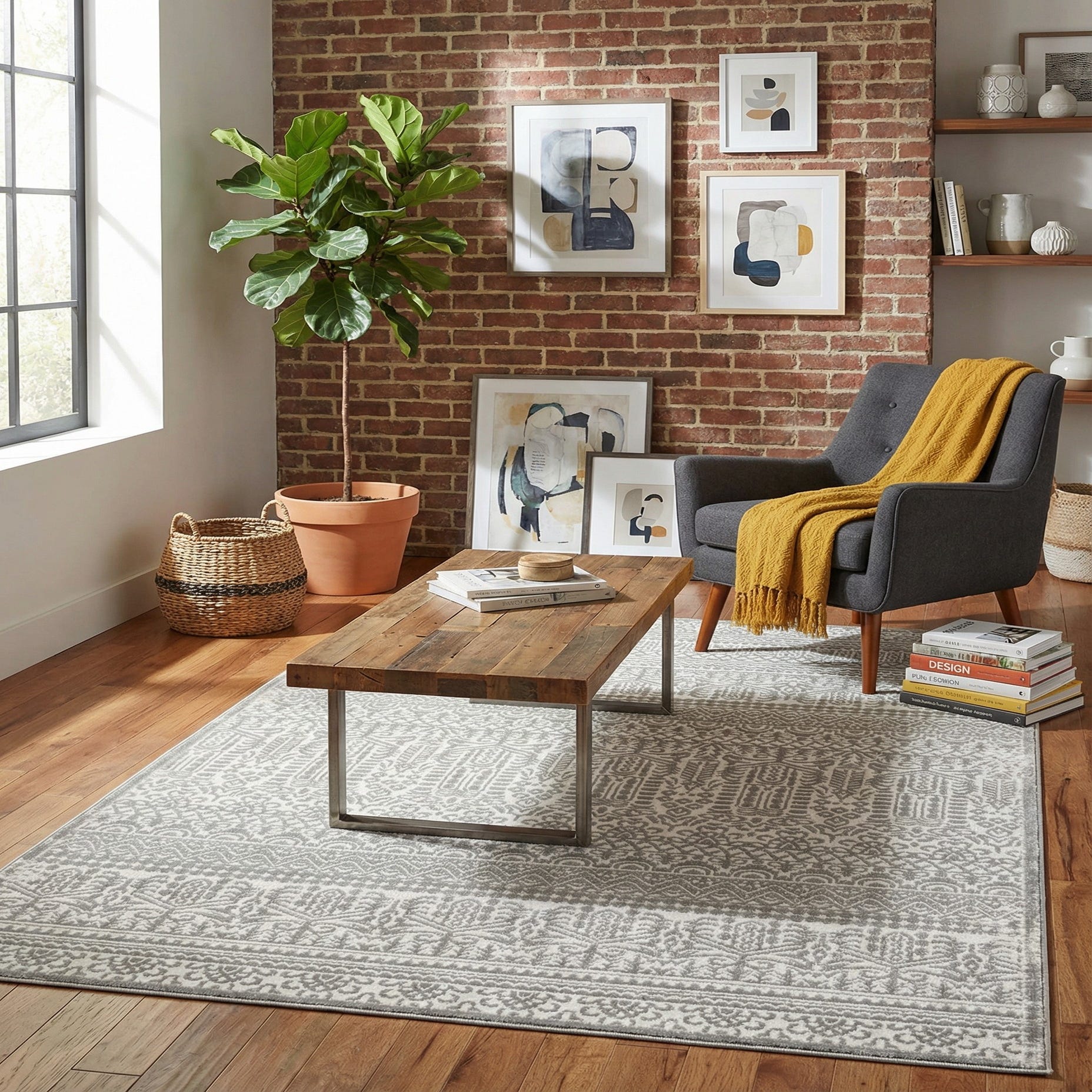 A 4x6 rectangular gray and silver farmhouse rug with textured stripes and intricate patterns, perfect for a living room.