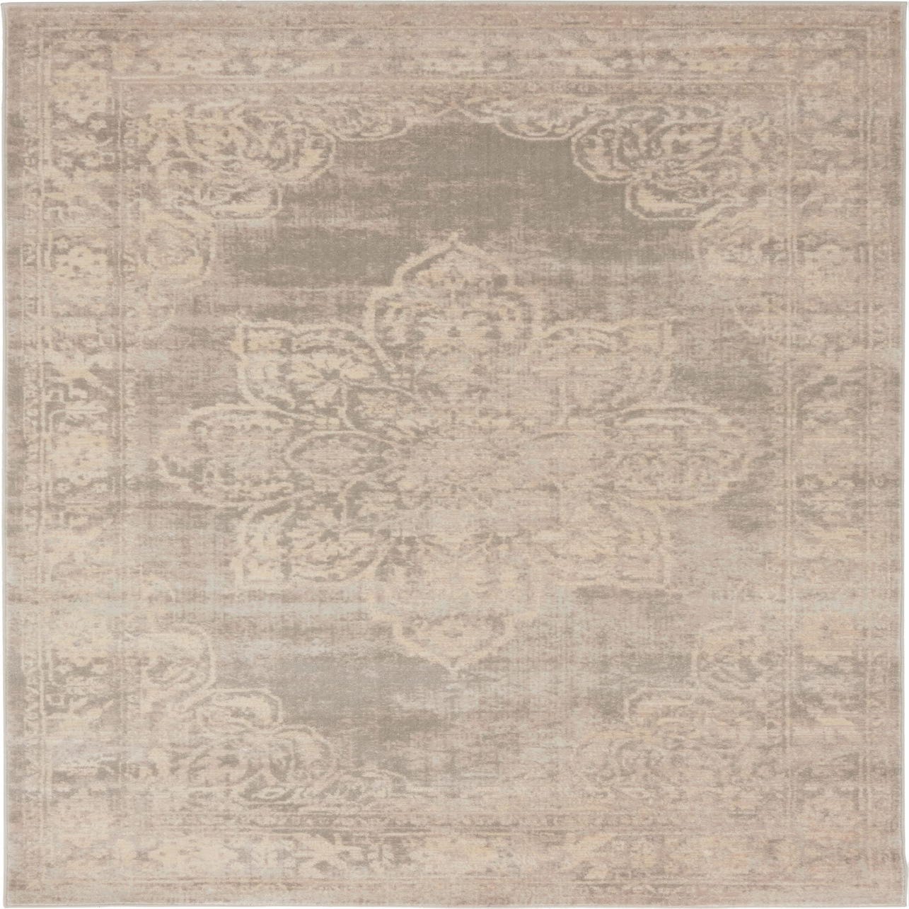 A soft gray field provides a calm backdrop for a gently distressed medallion and ornate border worked in beige and light brown. The traditional motif is softened by an aged, low-contrast finish that gives the pattern a lived-in look without heavy contrast. Fine detailing in the border and center medallion reads refined and restrained, creating a transitional style that bridges classic and contemporary interiors.