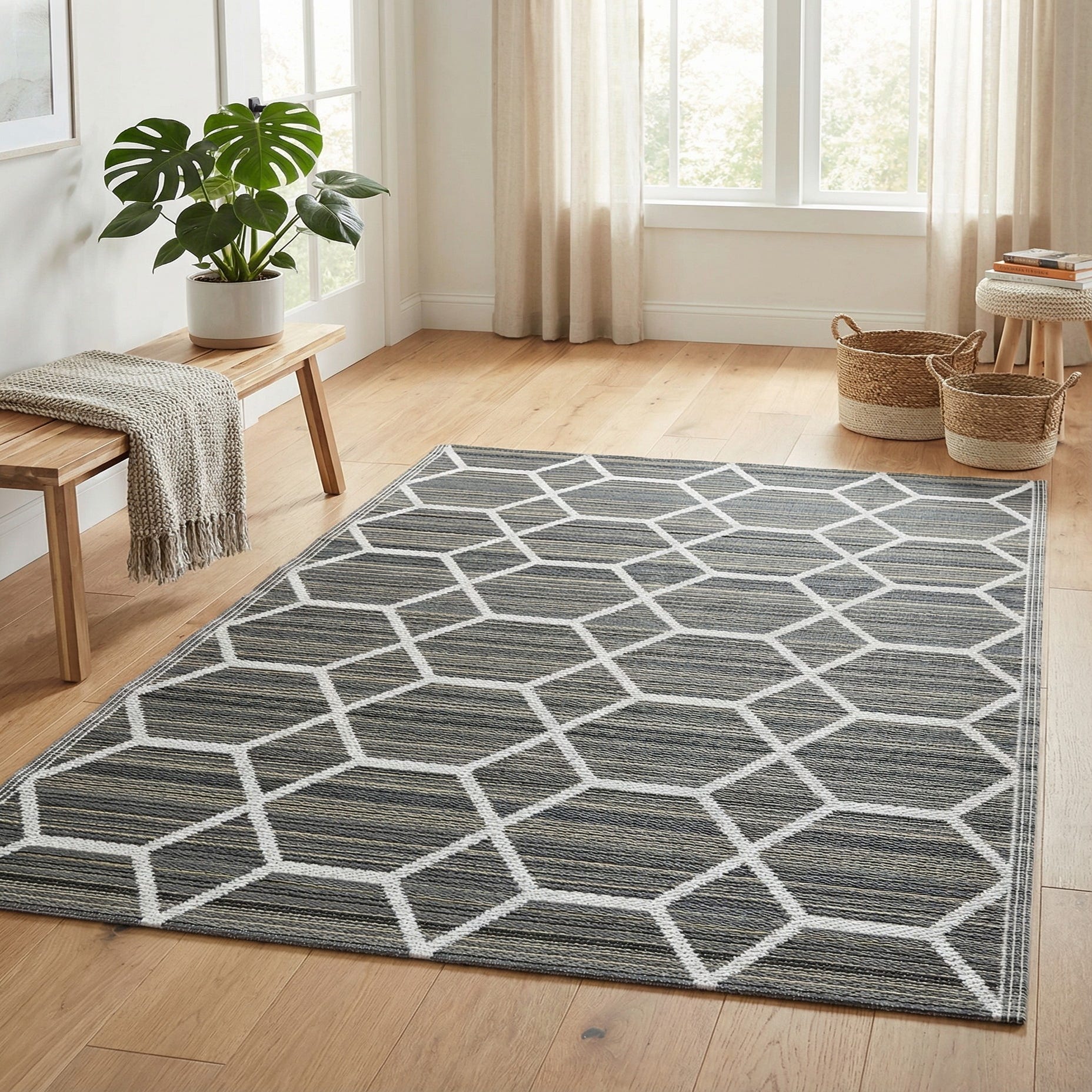 A 4x6 rectangular gray indoor/outdoor rug with a modern geometric honeycomb pattern in white, suitable for a patio or living room.