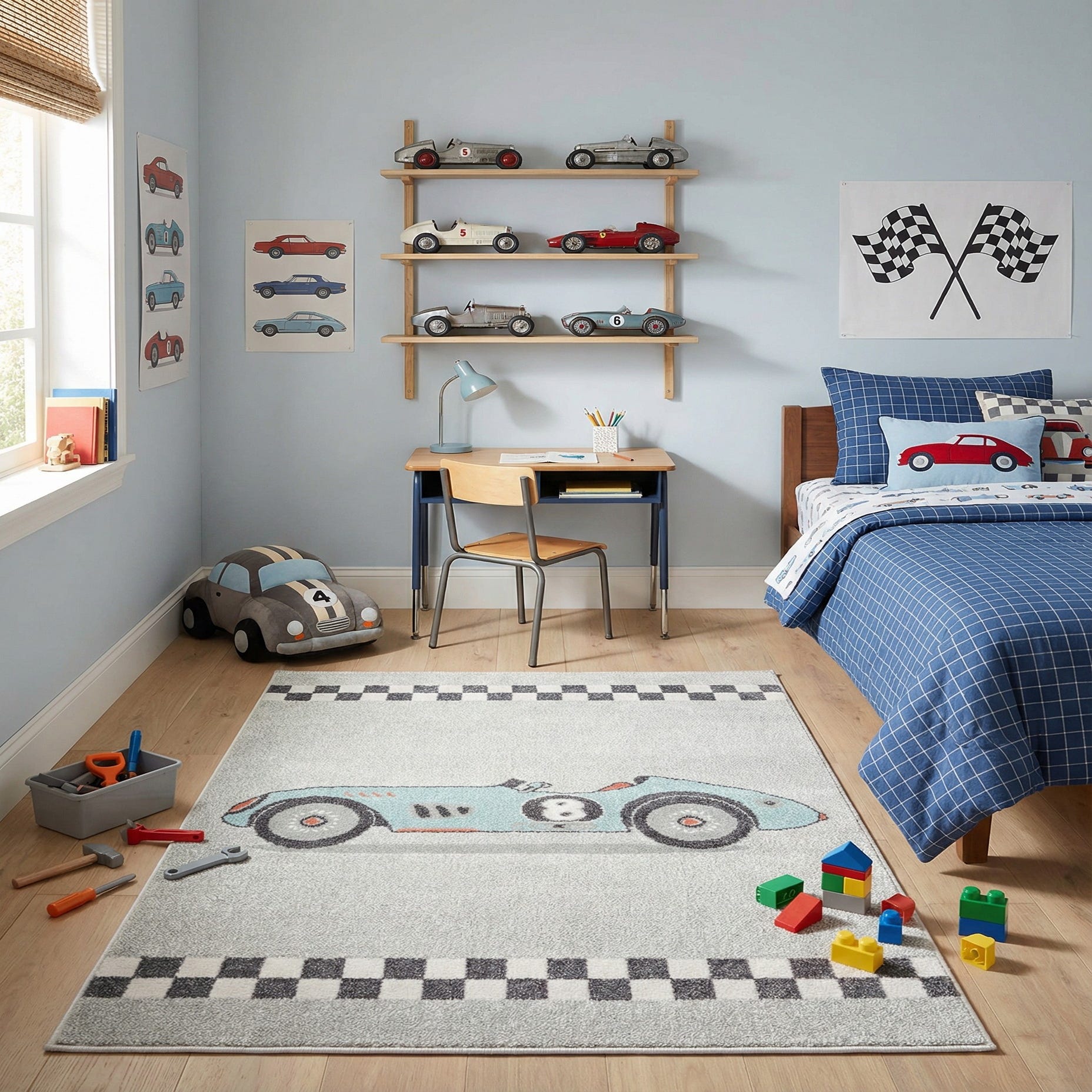 A soft gray field forms the backdrop for a playful, retro race-car motif rendered in light blue with black, ivory and red accents. A bold black-and-ivory checkerboard band anchors the top and bottom edges while the centered vintage-style car — complete with a numbered roundel and subtle red highlights — creates a clear focal point. Machine made from 100% polypropylene, the rug’s low-profile pile is even and slightly cushioned, giving the surface a smooth hand and crisp definition to the pattern.