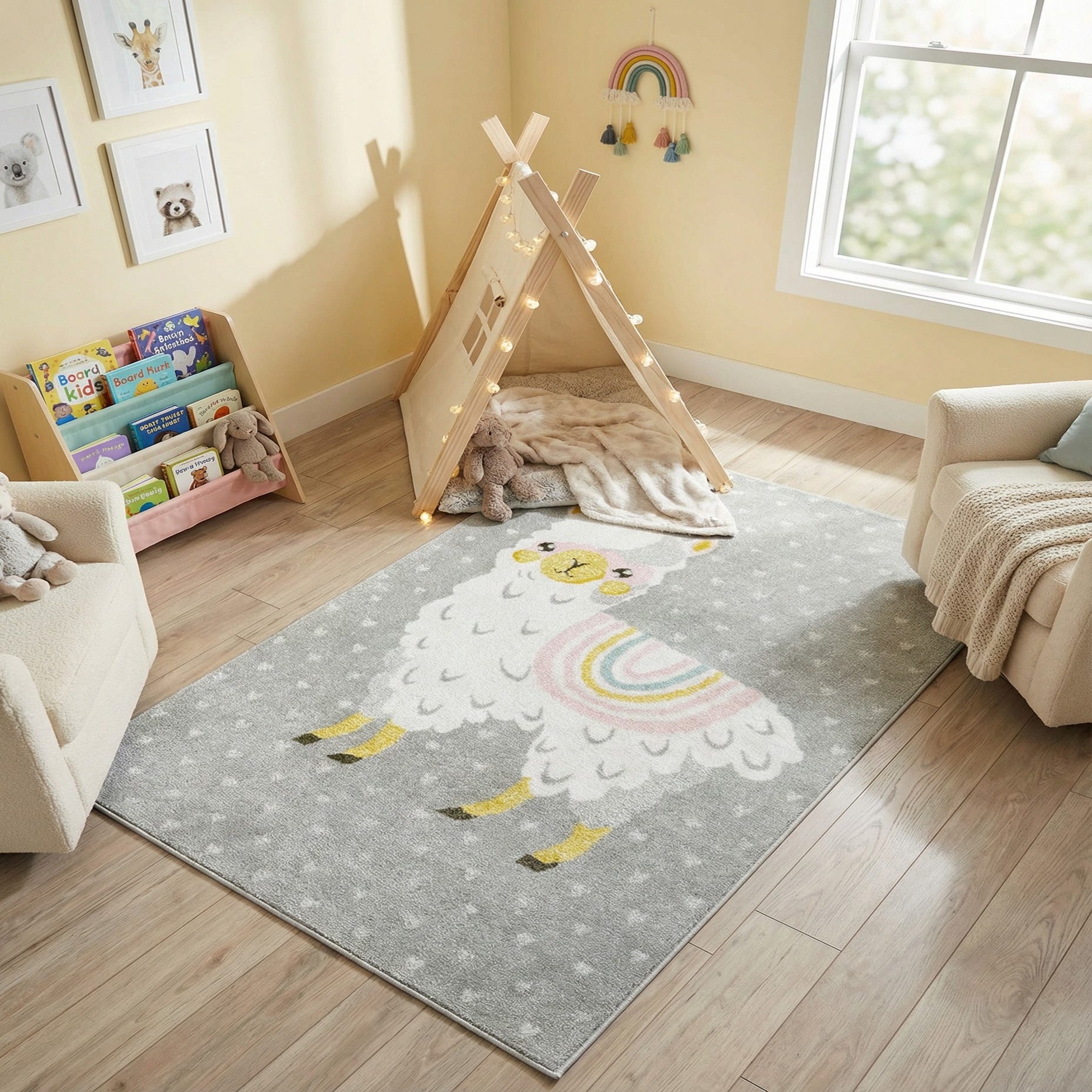 A rectangular gray kids' rug featuring a large, friendly white llama with a rainbow blanket, surrounded by tiny white hearts.