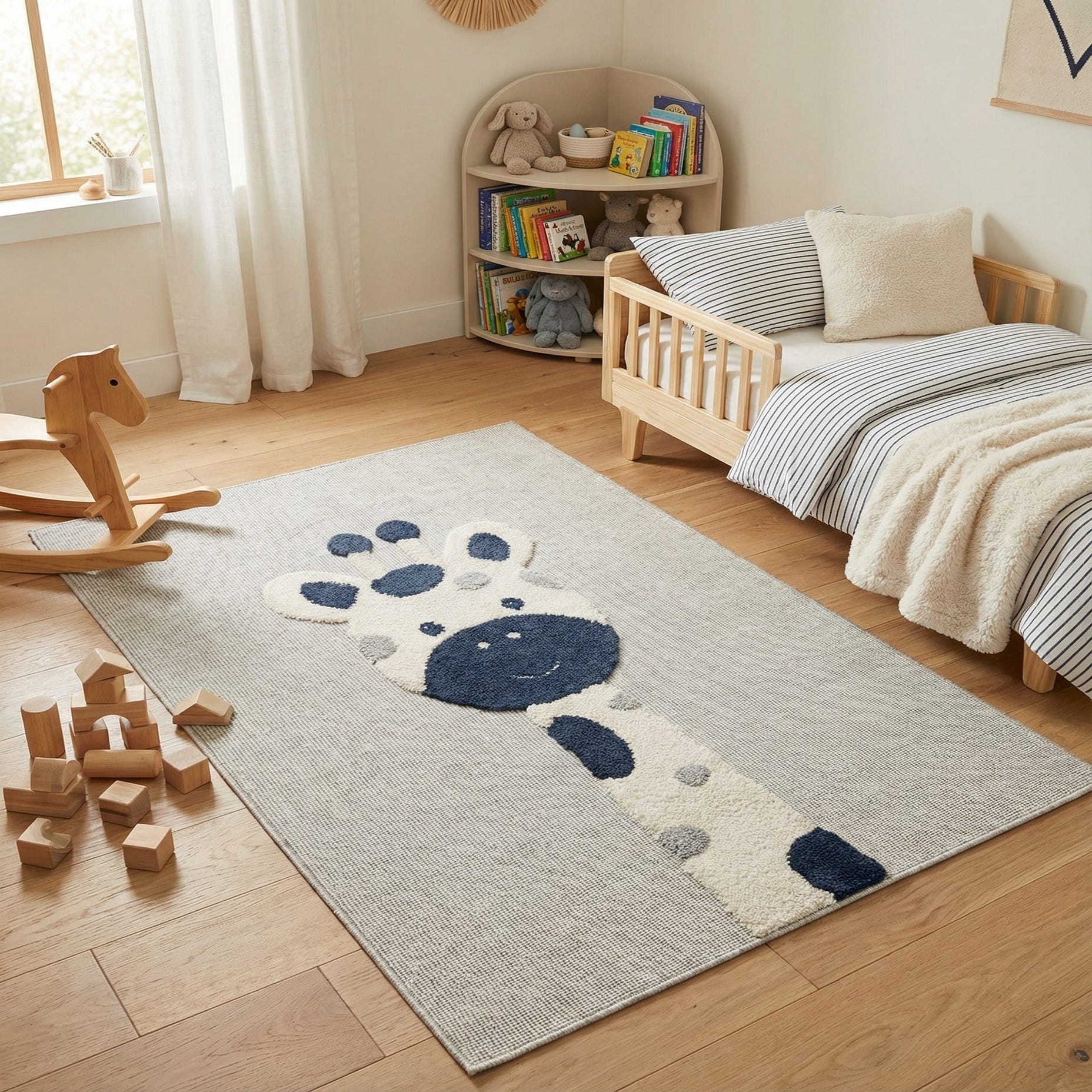 A playful giraffe motif takes center stage against a soft gray field, rendered in ivory with navy and light gray spots. The design balances simple, modern lines with a warm, friendly character—perfect for a child's space. The background has a low-profile, woven feel while the giraffe is rendered in a raised cut pile, so you can feel the contrast between the smooth ground and the plush, tufted motif beneath your fingertips.