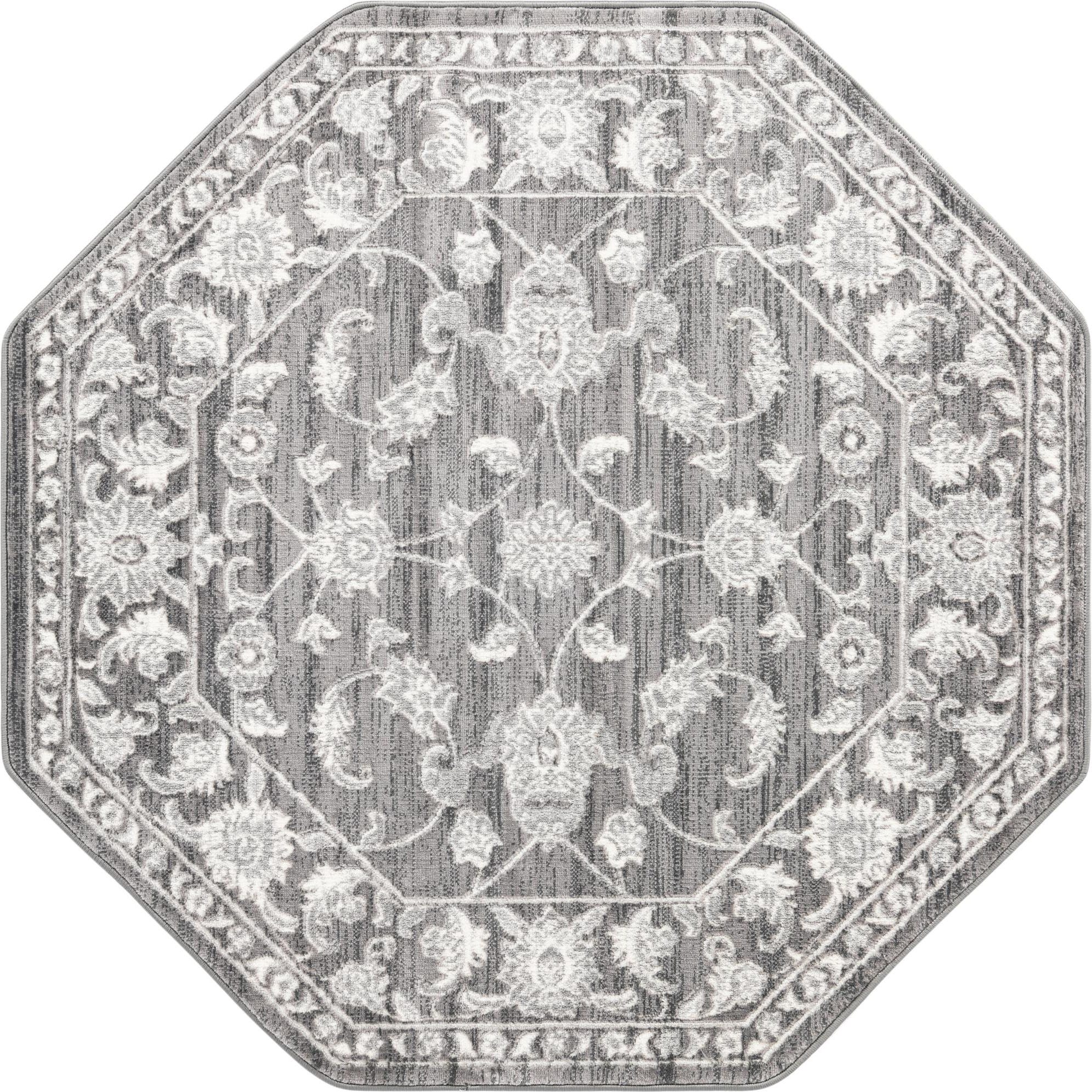 Octagon gray area rug with a detailed white traditional botanical pattern and border, suitable for various indoor spaces.