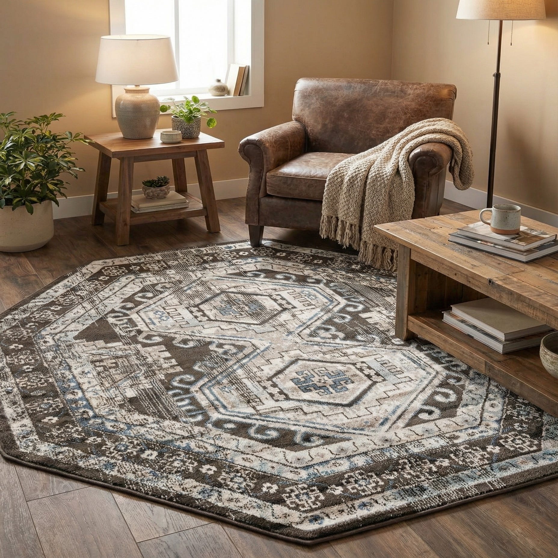 Thanks to its stain-resistant and shed-free qualities, this rug promises ease of maintenance, aligning with the practicality required in everyday living spaces. The octagonal shape provides a unique alternative to the standard rectangular area rugs, making it an interesting focal point for a variety of settings, including bedrooms, living areas, or under small dining arrangements. The intentional distressing in the pattern allows for seamless integration into rooms with a modern farmhouse, eclectic, or even minimalist decor where a touch of texture and depth is desired.