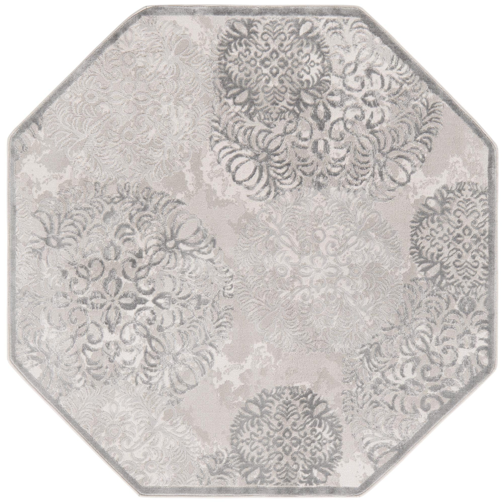 The Derbyshire collection presents a 5 Ft Octagon area rug, machine-woven from a blend of 60% polypropylene and 40% polyester. This rug features a balanced combination of gray and beige hues that form an intricate pattern reminiscent of traditional damask designs. The predominant gray background is complemented by the complex interplay of lighter and darker tones, creating a sense of depth and texture.