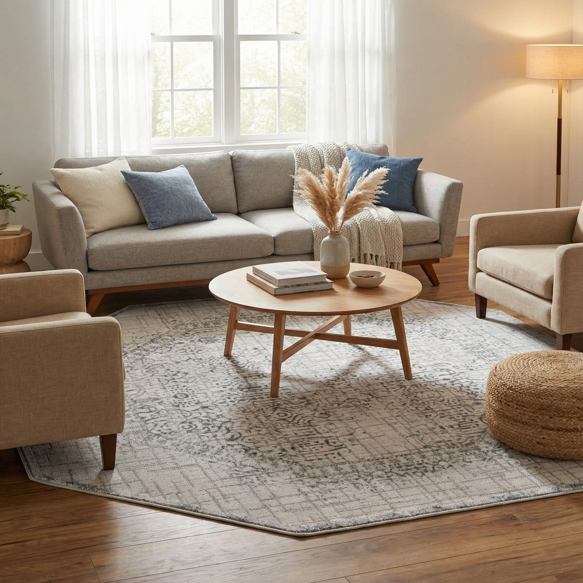 A soft gray background sets a calm stage for a gently distressed medallion motif in ivory and warm beige. Subtle crosshatch detailing adds a modern texture across the surface, while the worn-in pattern gives the rug a vintage-inspired, transitional look. Machine made of 60% polypropylene and 40% polyester, the dense, low-pile construction lies flat and feels smooth underfoot with a soft, textile hand and a low sheen that complements both casual and refined furnishings. The octagonal silhouette brings an unexpected geometric touch that helps define a seating area without overwhelming the space.
