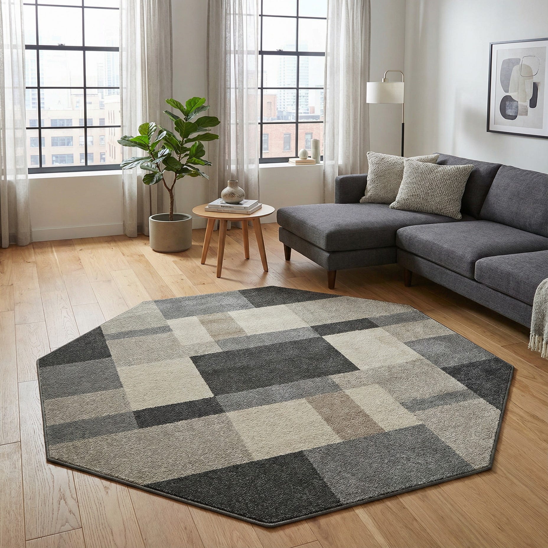 Clean, geometric blocks of gray, black and ivory form a modern grid across a soft gray background. The pattern balances larger rectangular fields with narrower bands, creating visual movement without overwhelming the space. Machine-made from 100% polypropylene, the rug has a low, dense pile that feels smooth to the touch and presents subtle tonal variation where the fibers catch the light.