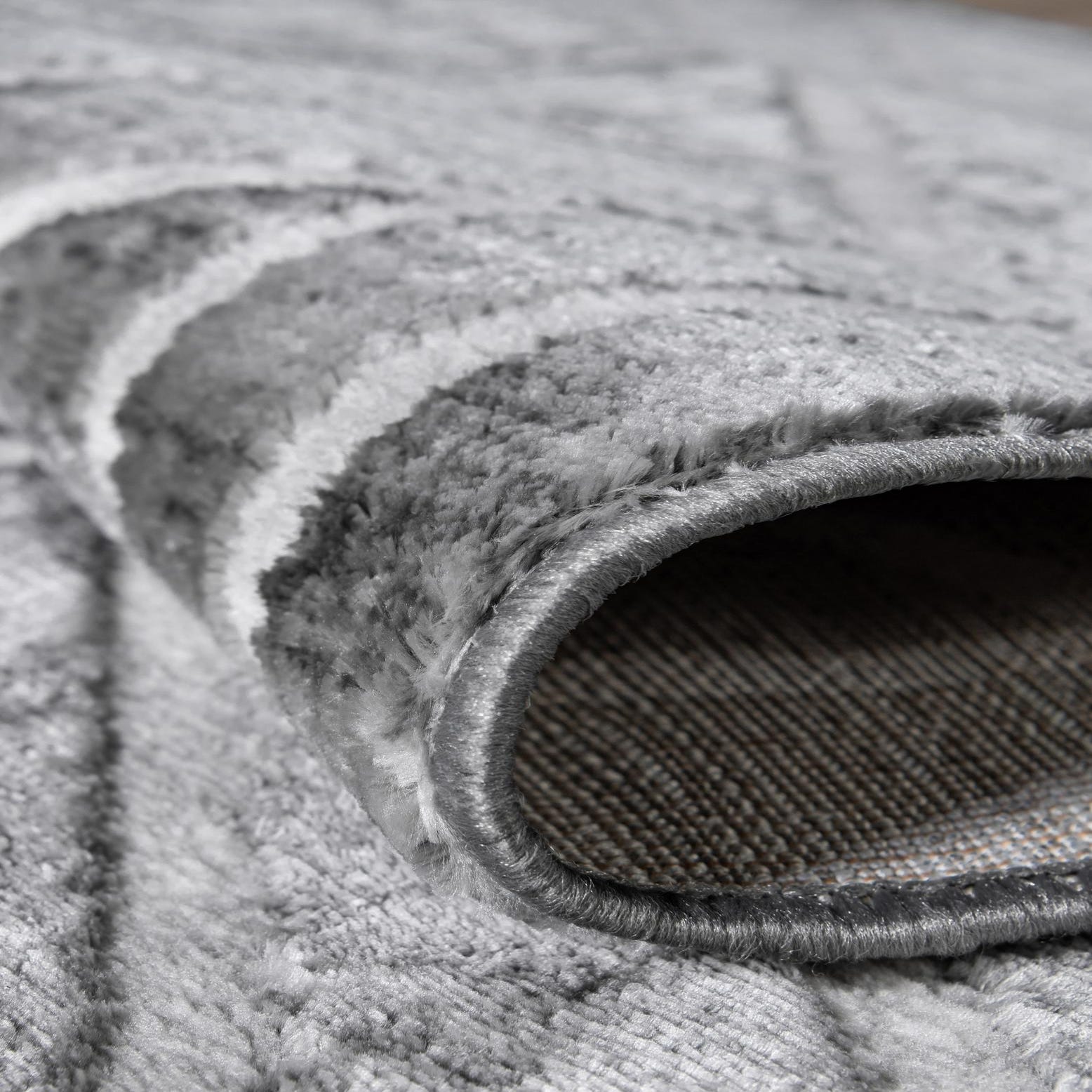Octagon-shaped gray and silver modern rug with a geometric lattice trellis pattern, featuring a textured pile.