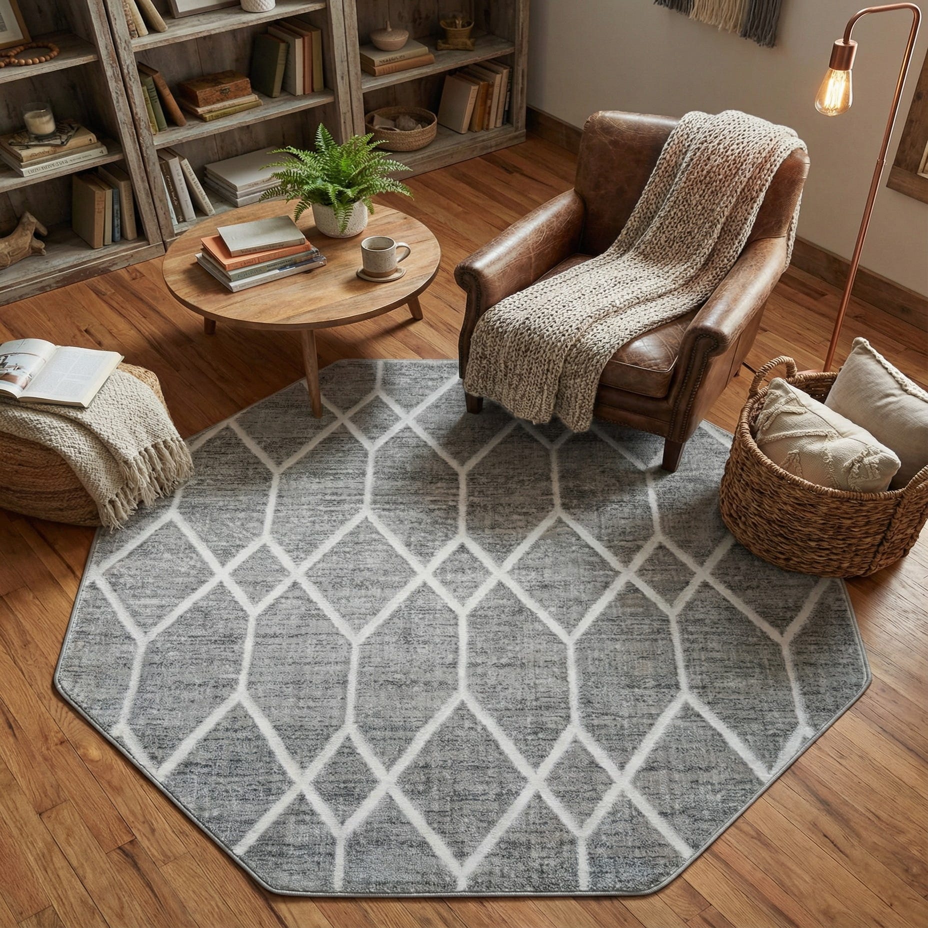 The neutral gray palette makes it a suitable addition to a variety of interior design themes, from contemporary to transitional settings. It can complement minimalistic spaces with clean lines as well as more eclectic decors that have a mix of patterns and textures. This octagonal rug can be used to define a seating area, provide a symmetrical anchor in a small room or sitting area, or placed underneath a statement piece of furniture like a circular dining table to add interest and softness to the space.