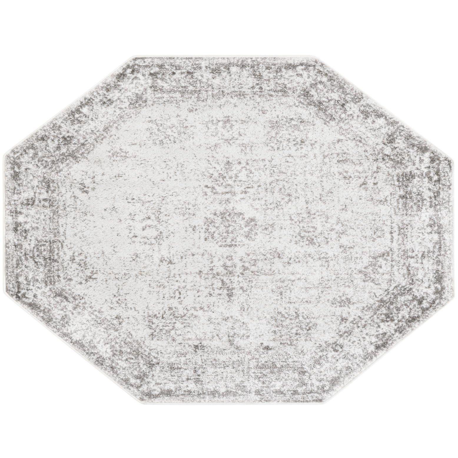 A softly distressed pattern gives this octagonal rug a quiet, layered look. The gray background forms a neutral base while subtle beige highlights trace a faded border and central field, creating gentle depth without bold contrast. Machine-made from 100% polypropylene, the pile has a smooth, low-to-medium profile with a slightly velvety hand and a muted sheen that catches light across the surface.