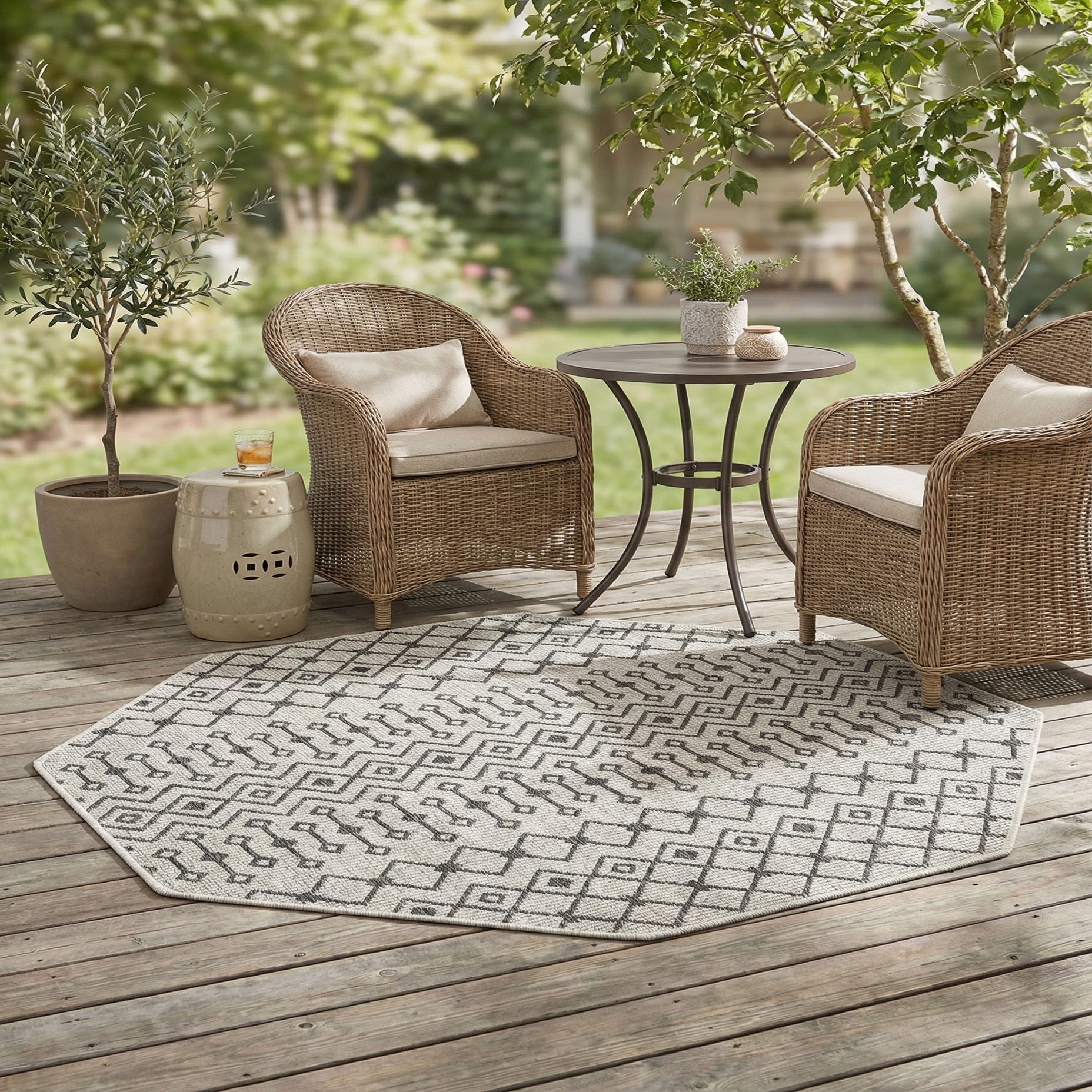 The octagon shape makes it a good fit for a small seating nook, a covered patio or balcony, or centered under a bistro table or entryway bench. Pair it with light wood or metal furniture, neutral linens, and simple accessories for a modern Scandinavian or industrial vibe, or layer it with natural textures and muted colors for a relaxed coastal or contemporary farmhouse setting.