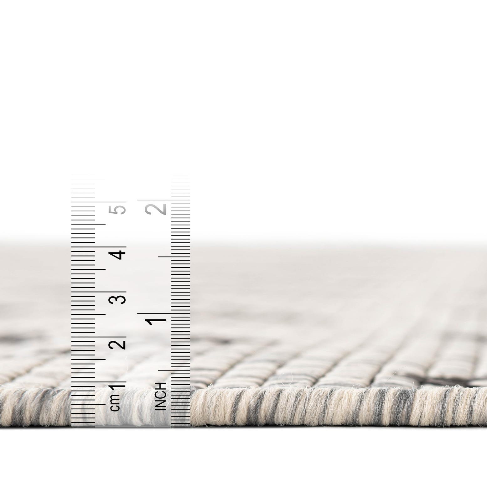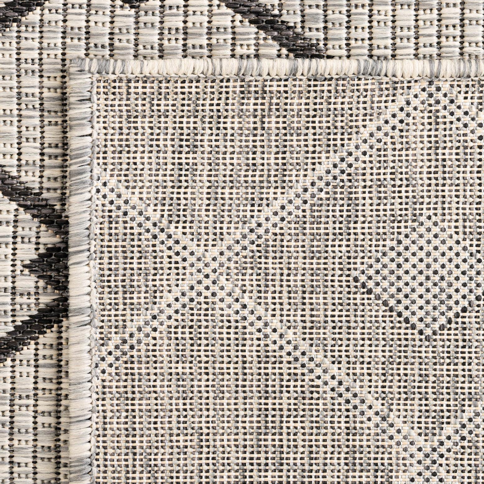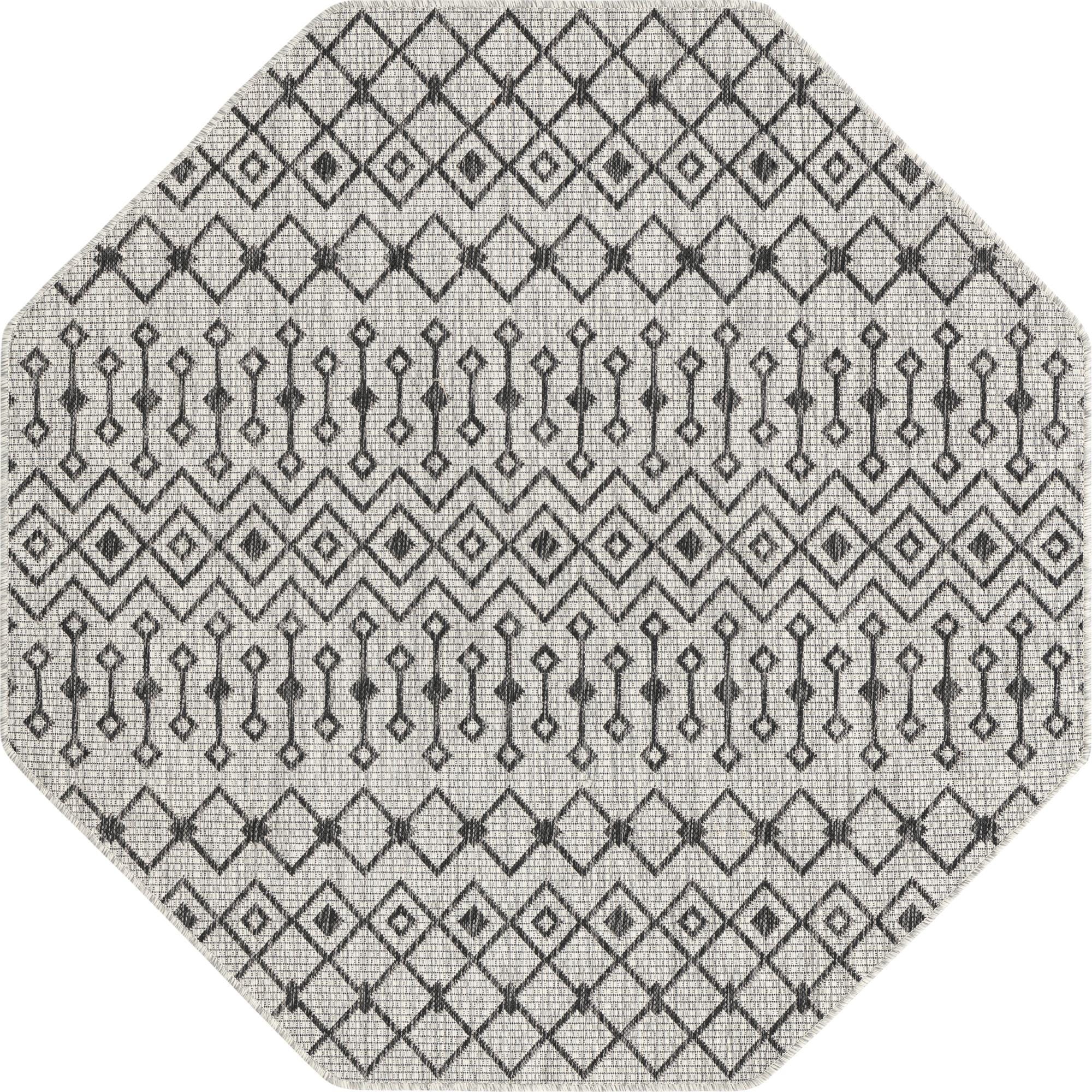 A subtle, octagonal rug with a gray background and black geometric motifs, this piece lays out repeating diamond lattices and linear accents in horizontal bands. Machine-made of 100% polypropylene, it has a low-profile, flatwoven texture that feels firm underfoot while the pattern provides visual depth through tightly rendered lines and small diamond details. The contrast between the gray ground and black design keeps the look clean and graphic without being busy.