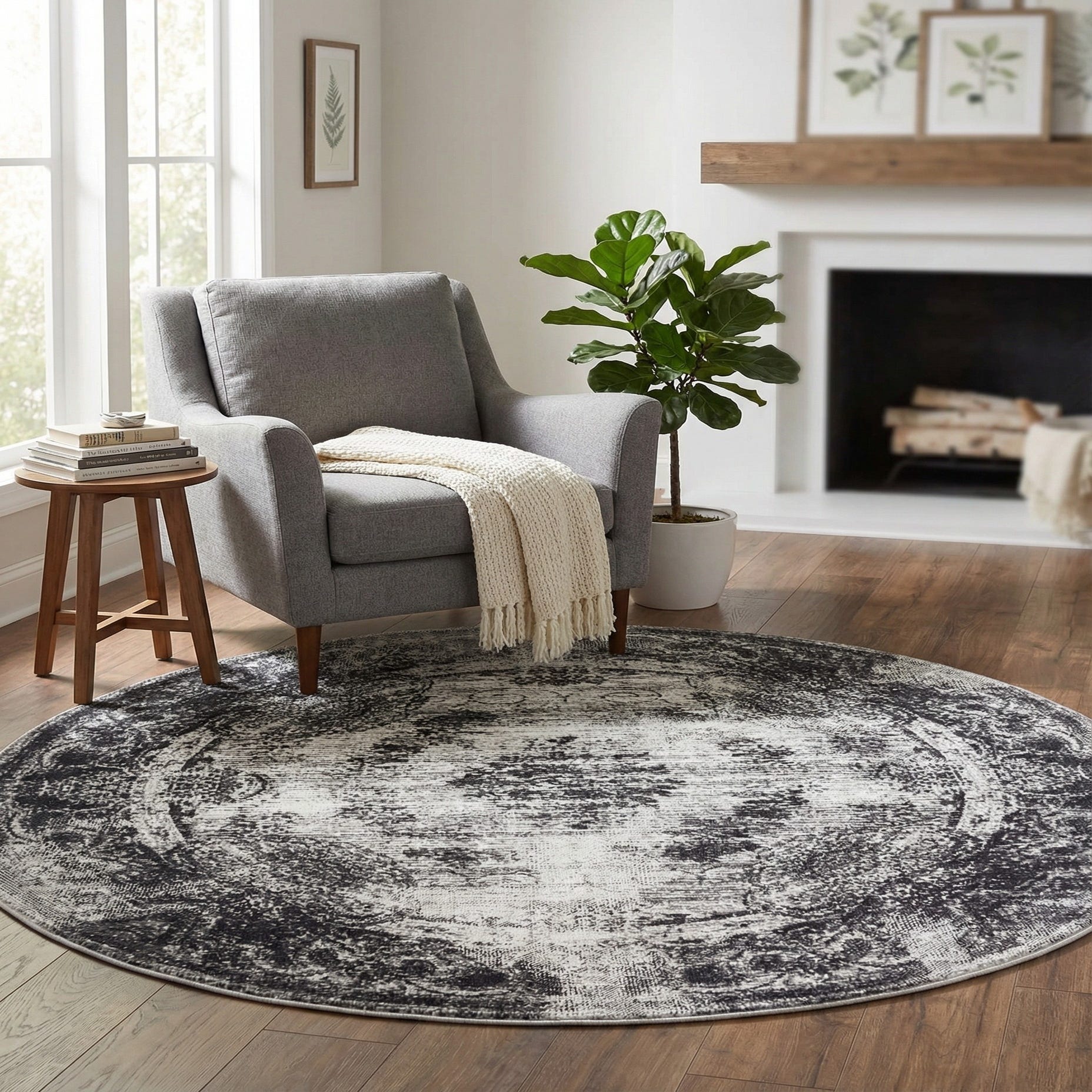 Place it beneath a round dining table or in an entry to anchor a compact seating area; it also layers nicely in a living room to define a conversation nook. The gray-and-ivory palette complements Scandinavian and transitional interiors, pairs cleanly with natural wood and leather accents, and softens industrial or modern settings when used alongside warm textiles and metal finishes.