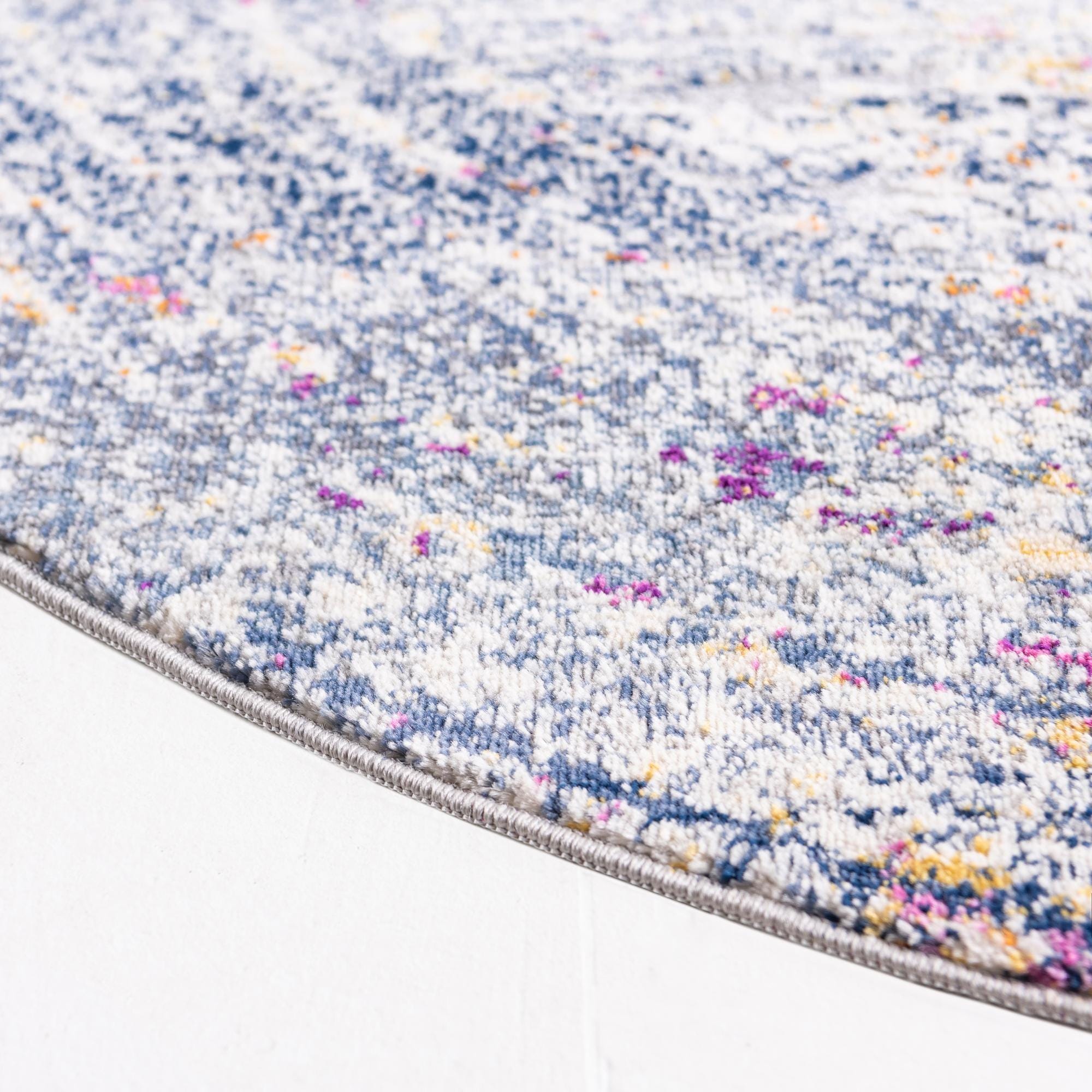 A soft, low-pile rug with a gray background and a worn-vintage motif, this round piece centers on a faded medallion that blends traditional ornament with a distressed, painterly finish. Navy and blue tones weave through the field and outer banding, while ivory highlights and warmer pops of terracotta, red, pink and olive punctuate the central design. Machine made from 70% polypropylene and 30% polyester, the surface feels smooth and slightly cushioned underfoot with a subtle sheen from the polyester fibers that adds depth to the layered colorwork.