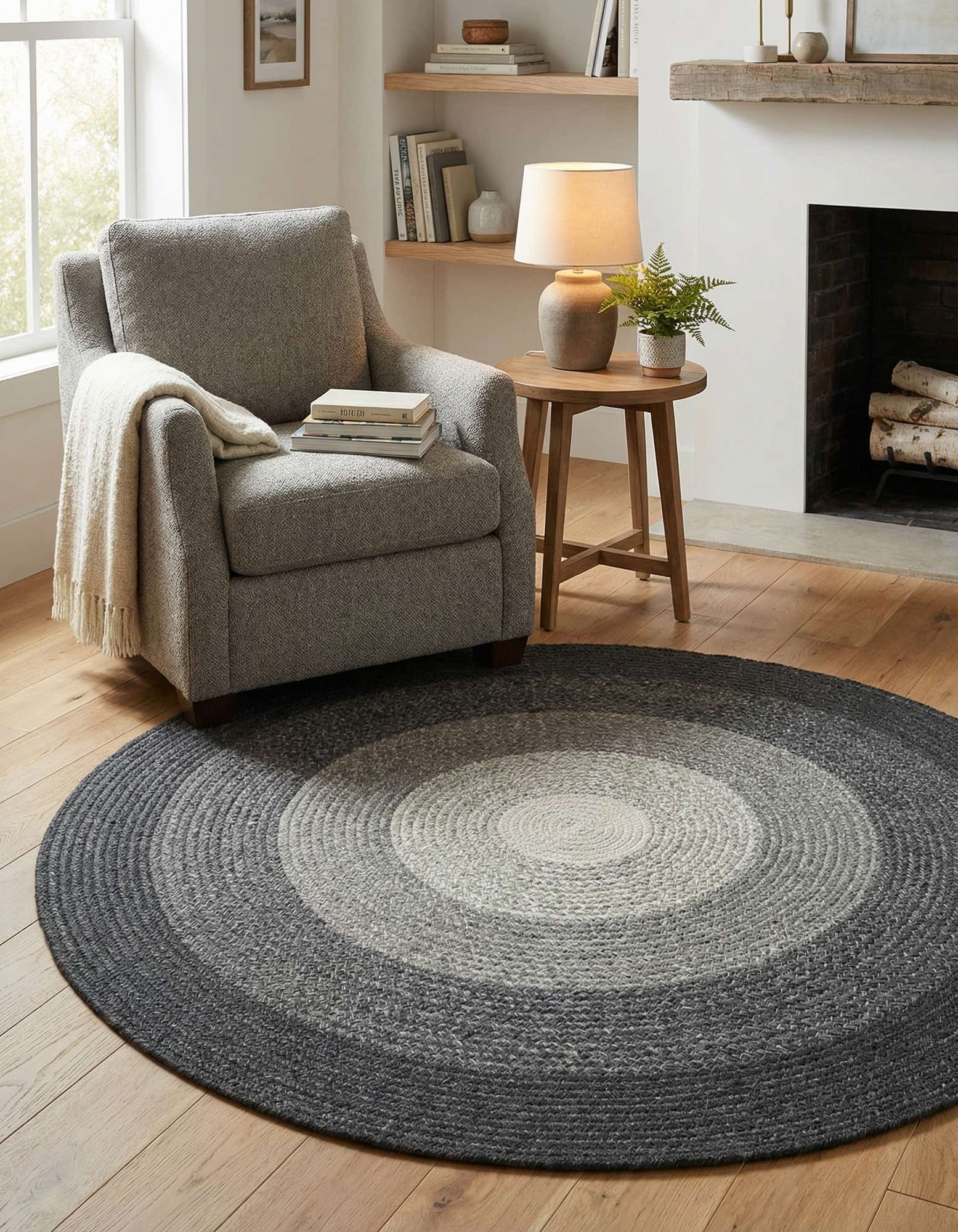 A 5' 1 round gray braided wool rug with a modern ombre design, transitioning from dark gray to light gray at the center.