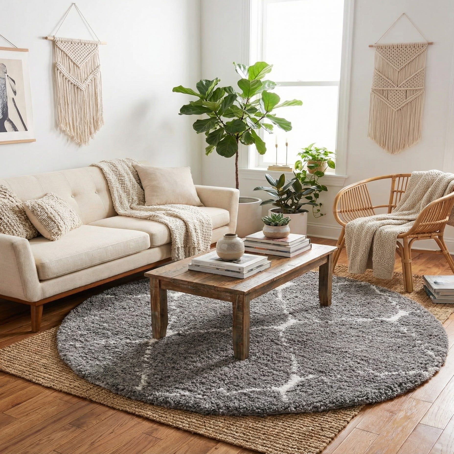 A round 5' gray shag rug with a white trellis pattern, offering a soft, textured feel.