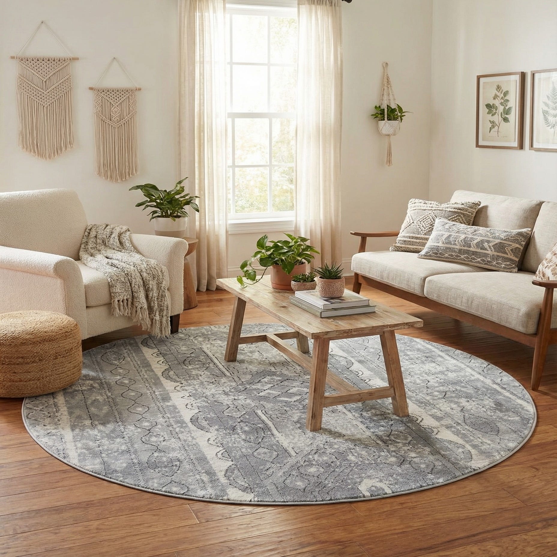 This round rug works well in transitional and modern farmhouse interiors as well as coastal and Scandinavian-inspired rooms. Place it beneath a round dining table or in a seating nook to anchor the arrangement, or layer it over hardwood or tile to add warmth and pattern. It pairs nicely with light woods, linen upholstery and muted accent colors, bringing a quiet, refined backdrop to living rooms, bedrooms and entry areas.