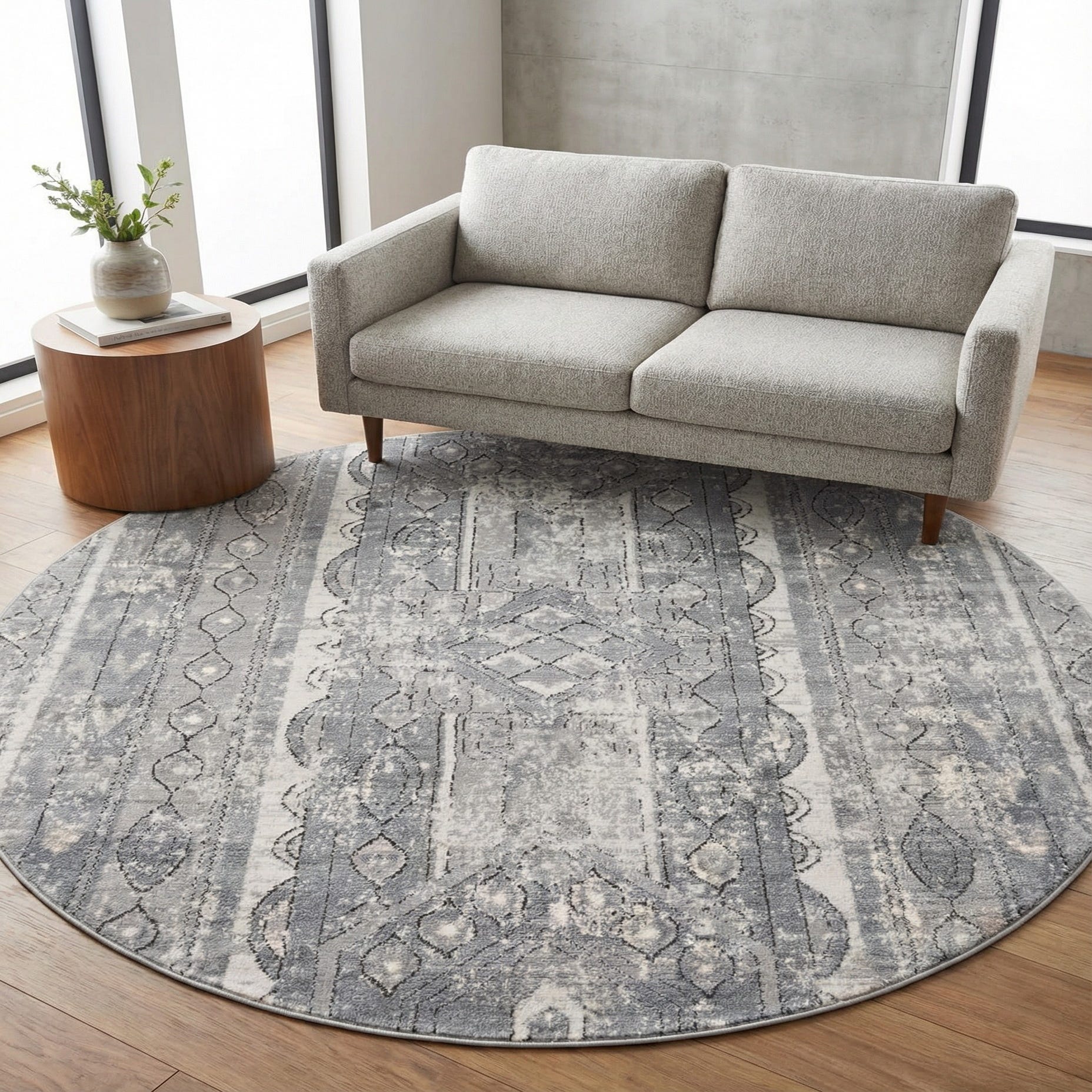 A softly distressed, vintage-inspired pattern combines a central medallion with vertical bands, scalloped edges and diamond motifs for a layered, dimensional look. The background is gray with ivory highlights that pick out the ornamental details, giving the rug a calm, neutral presence. Machine made from 85% polypropylene and 15% polyester, it has a low-profile pile with subtle cut-and-loop variations that create gentle texture underfoot and a soft, slightly lustrous finish.