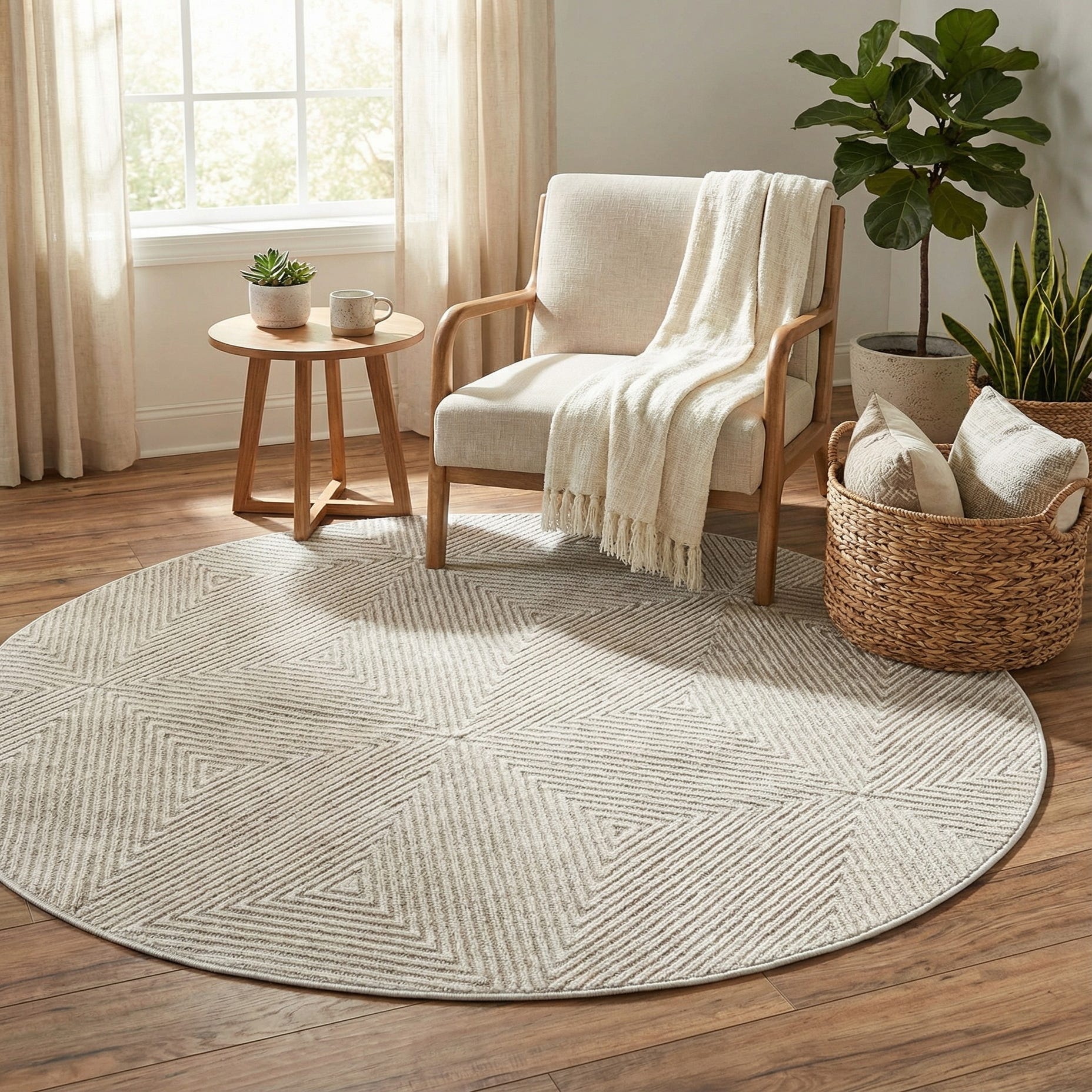 A 5' round gray modern rug with a subtle geometric striped triangle pattern, suitable for indoor or outdoor use.