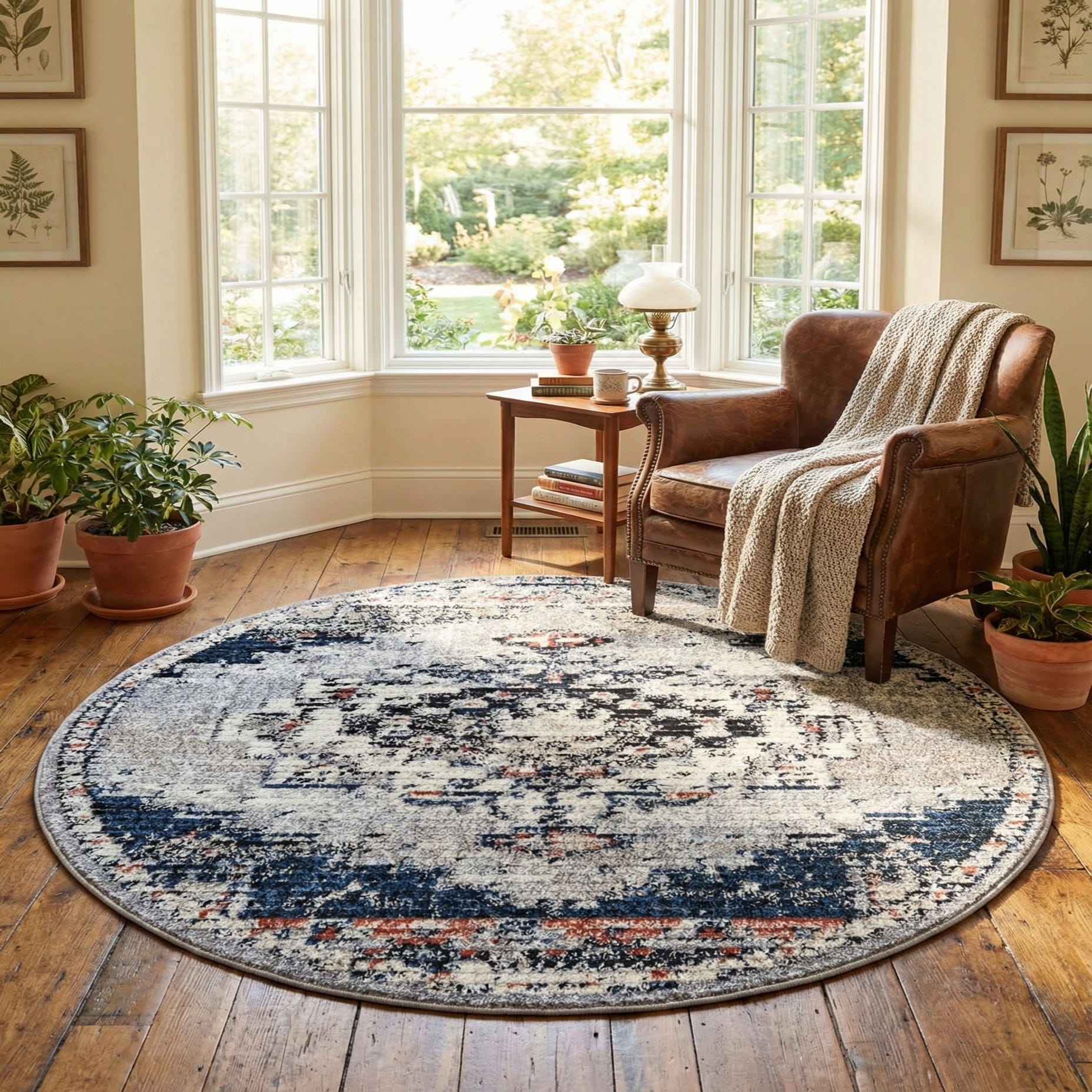 Machine made from 100% polyester, the rug has a soft, slightly plush pile that feels comfortable underfoot while maintaining a low-profile silhouette. Its scale and round shape make it well suited for a small dining nook or bistro table, layered beneath a round coffee table in a seating area, or placed in an entry to define a foyer. Works especially well with warm wood furniture, navy or black metal accents, neutral upholstery, and textile accents in rust or beige for a cohesive, layered interior.