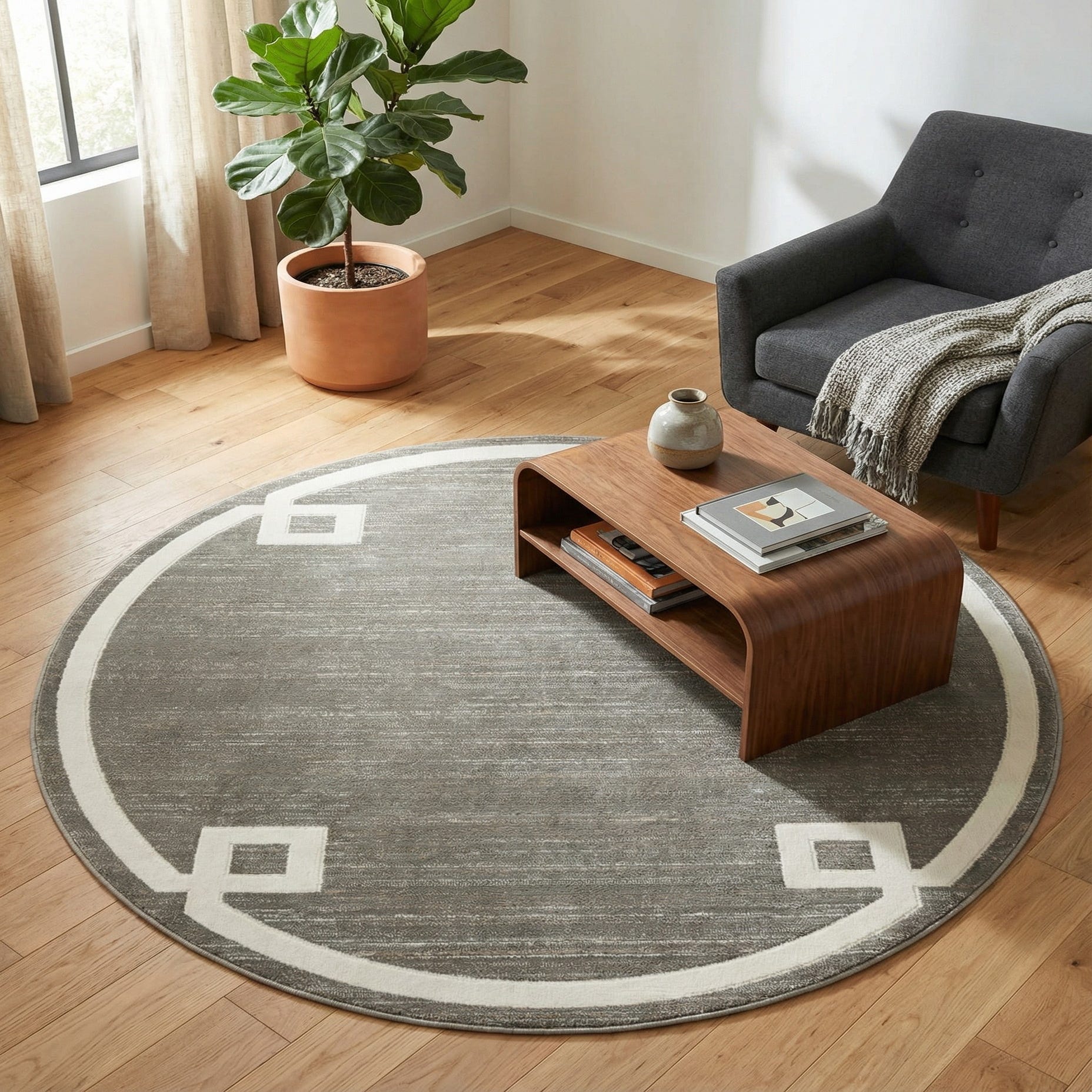 Machine-made from 70% polypropylene and 30% polyester, the low-profile pile feels soft and smooth underfoot with a gentle, slightly lustrous finish from the polyester fibers. Place it beneath a round dining or bistro table, anchor a cozy seating nook, or use it to soften hardwood or tile in a bedroom or home office. Its neutral palette and geometric motif pair well with mid-century modern furnishings, streamlined transitional decor, or layered textures like leather and warm wood tones.