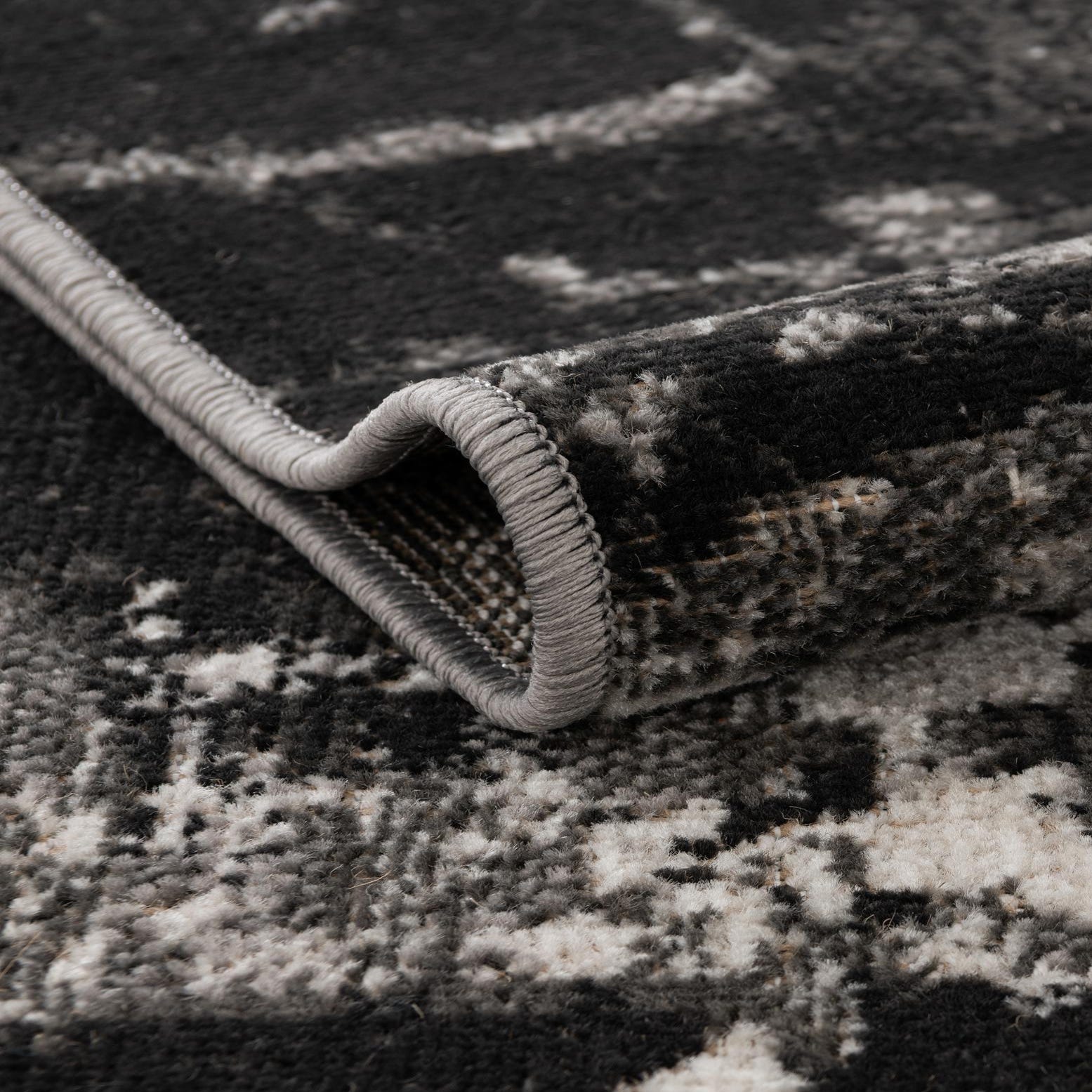 Primary color is Gray. Colors in this rug include: Gray, Black, Blue, Ivory.