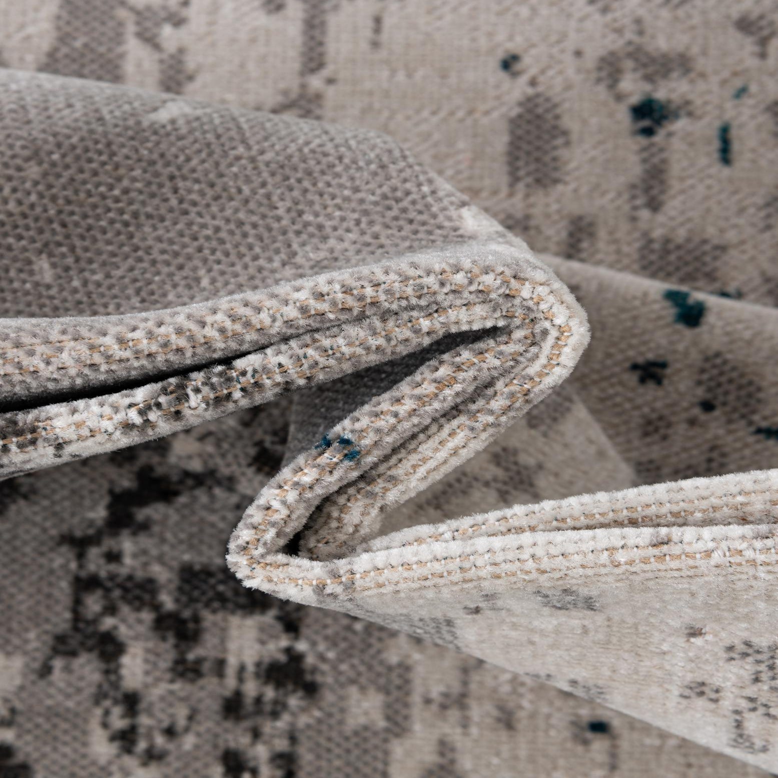 A 5' 3 round rug featuring an abstract, eclectic pattern in shades of gray, silver, and teal blue, suitable for modern indoor spaces.