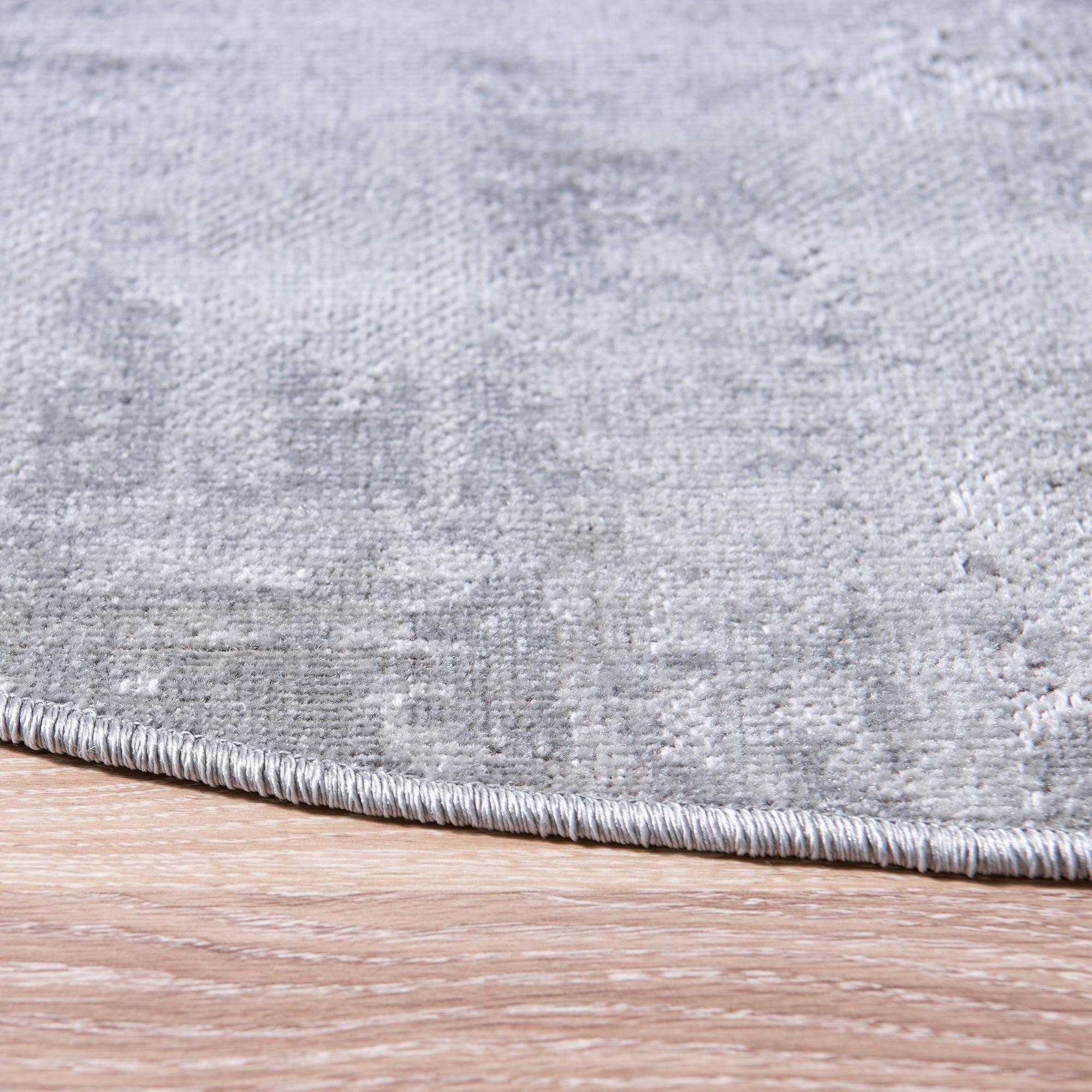 A 5' 3 round gray area rug with a distressed, abstract pattern in lighter silver tones, suitable for modern indoor spaces.