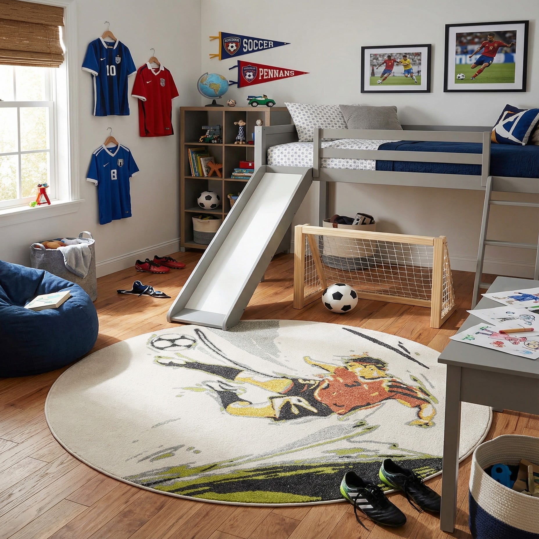 The round silhouette and sporty motif work well in a child's bedroom, playroom, or a casual rec area—especially in spaces with a contemporary or transitional feel. Pair it with neutral walls and furniture, then bring out the rug’s colors with red or green throw pillows and simple storage solutions, or place it beneath a reading nook or small seating cluster to create a lively focal point.
