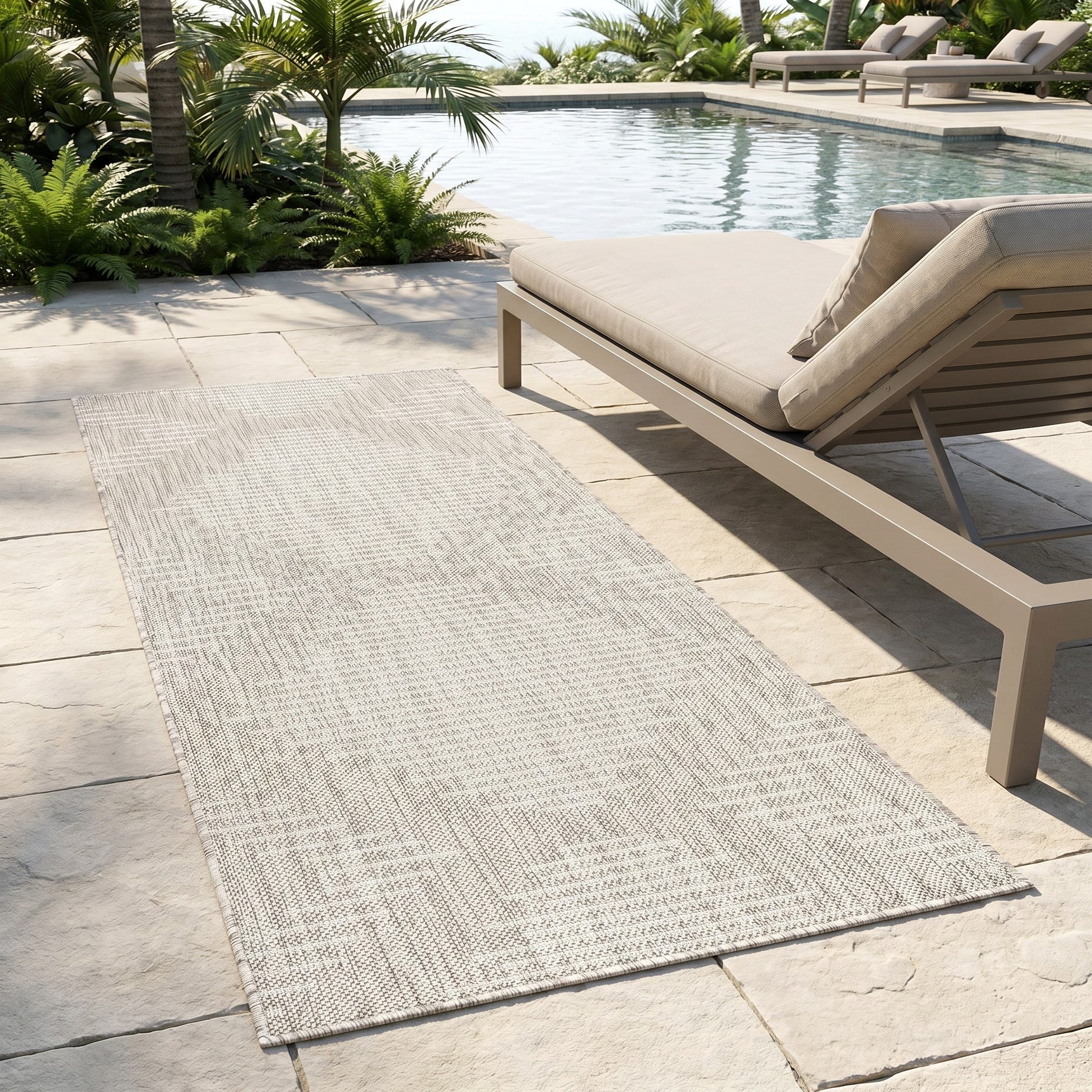 Love the contemporary look of this rug! We are so happy we chose this to accent the blue of our pool with our living area on our lanai. We still are going to add a few more pillows but love the rug to add color.